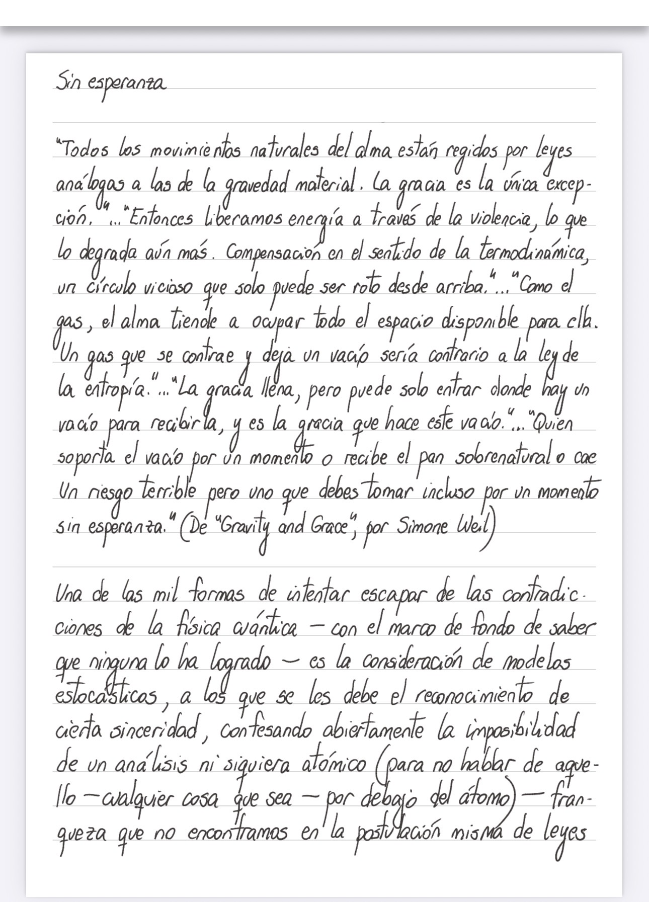 “Todos los movimientos naturales del alma están elegidos por leyes análogas a las de la gravedad material. La gracia es la única excepción.” …”Entonces liberamos energía a través de la violencia, lo que la degrada aún más. Compensación en el sentido de la termodinámica, un círculo vicioso que solo puede ser roto desde arriba.”…”Como el gas, el alma tiende a ocupar todo el espacio disponible para ella. Un gas que se contrae y deja un vacío sería contrario a la ley de la entropía.”…”La gracia llena , pero puede solo entrar donde hay un vacío para recibirla, y es la gracia la que hace este vacío.”…”Quien soporta el vacío por un momento o recibe el pan sobrenatural o cae. Un riesgo terrible pero uno que debes tomar incluso por un momento sin esperanza.” (De “Gravity and Grace”, por Simone Weil)