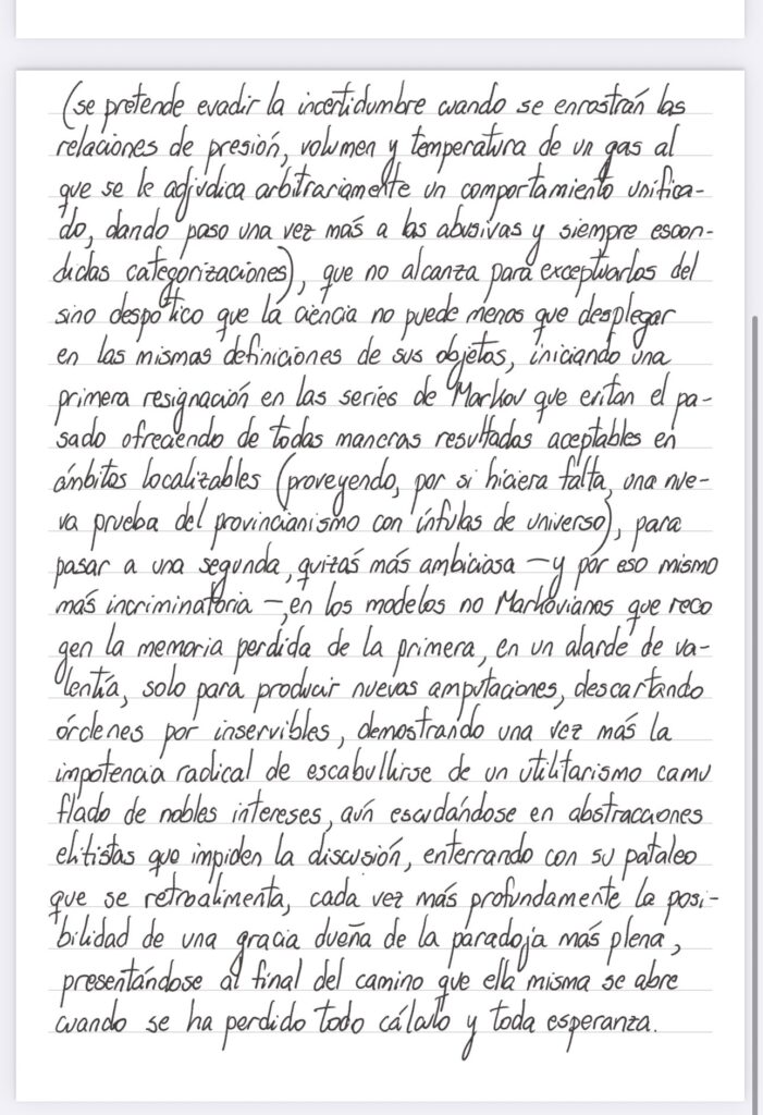 Una de la mil formas de intentar escapar de las contradicciones de la física cuántIca – con el marco de fondo de saber que ninguna lo ha logrado – es la consideración de modelos estocásticos, a los que se les debe el reconocimiento de cierta sinceridad, confesando abiertamente la imposibilidad de un análisis no siquiera atómico (para no hablar de aquello – cualquier cosa que sea – por debajo del átomo) – franqueza que no encontramos en la postulación misma de leyes (se pretende evadir la incertidumbre cuando se entierran las relaciones de presión, volumen y temperatura de una gas al que se le adjudica arbitrariamente un comportamiento unificado, dando paso una vez más a las abusivas y siempre escondidas categorizaciones), que no alcanza para exceptuarlas del sino despótico que la ciencia no puede menos que desplegar en las mismas definiciones de sus objetos, iniciando una primera resignación en las series de Markov que evitan el pasado ofreciendo de todas maneras resultados aceptables en ámbitos localizables (proveyendo, por si hiciera falta, una nueva prueba del provincianismo con ínfulas de universo), para pasar a una segunda, quizás más ambiciosa – y por eso mismo más incriminatoria -, en los modelos no markovianos que reciben la memoria pérdida de la primera, en un alarde de valentía, solo para producir nuevas amputaciones, descartando órdenes de grados superiores por inservibles, demostrando una vez más la impotencia radical de escabullirse de un utilitarismo camuflado de nobles intereses, aún escudándose en abstracciones elitistas que impide la discusión, enterrando con su pataleo que se retroalimenta, cada vez más profundamente la posibilidad de una gracia dueña de la paradoja más plena, presentándose al final del camino que ella misma se abre cuando se ha perdido todo cálculo y toda esperanza.