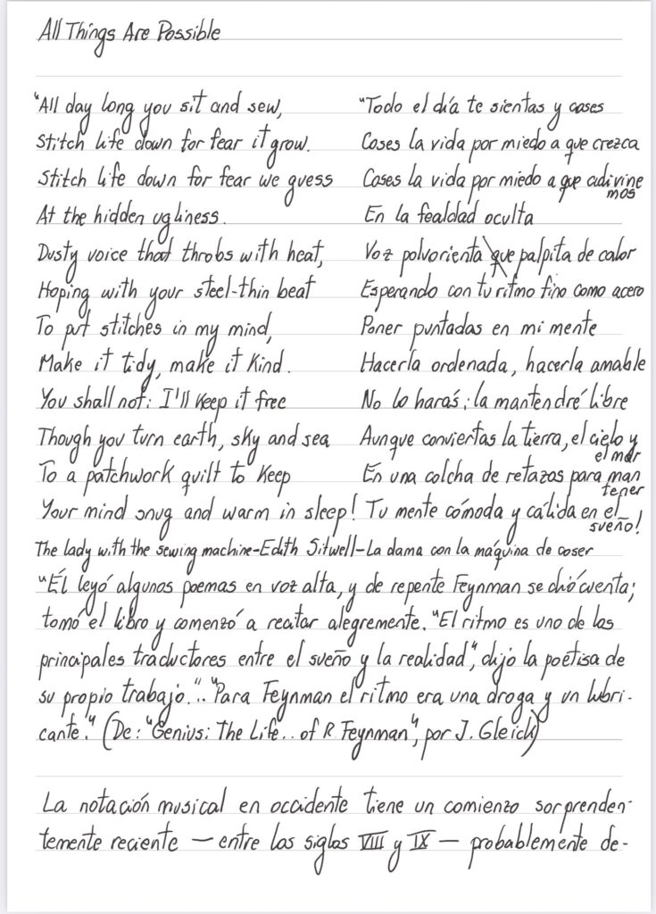 «El leyó algunas poemas on voz alta, y de repente Feynman se dió cuenta; tomó el libro y comenzó a recitar alegremente. «El ritmo es uno de los principales traductores entre el sueño y la realidad” dijo la poetisa de su propio trabajo”…”Para Feynman el ritmo era una droga y un lubricante” (De “Genius: The life…of R. Feynman”, por J. Gleick)