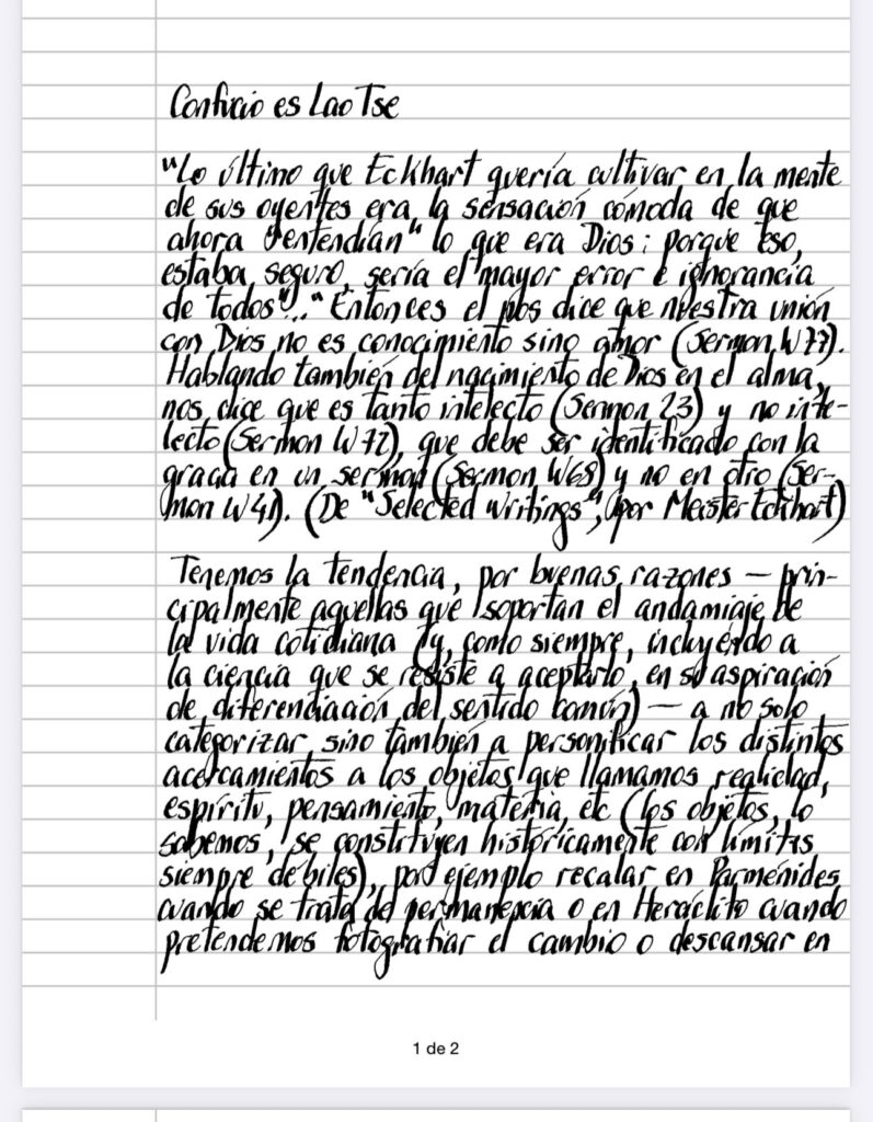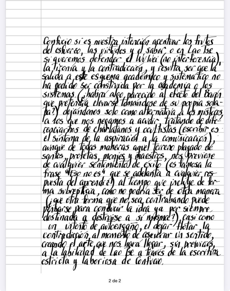 Tenemos la tendencia, por buenas razones – principalmente aquellas que soportan el andamiaje de la vida cotidiana (y, como siempre, incluyendo a la ciencia que se resiste a aceptarlo, en su aspiración de diferenciación del sentido común) – a no solo categorizar sino también a personificar los distintos acercamientos a los objetos que llamamos realidad, espíritu, pensamiento, materia, etc (los objetos, lo sabemos, se constituyen históricamente con límites siempre débiles), por ejemplo recalar en Parménides cuando se trata de permanencia o en Heráclito cuando pretendemos fotografiar el cambio o descansar en Confucio si es nuestra intención acentuar los frutos del esfuerzo, las virtudes y el saber o en Lao Tse si queremos defender el Wu Wei (no interferencia 0, la ironía y la contradicción, y resulta ser que la salida a este esquema académico y sistemático no ha podido ser construida por la academia o los sistemas.(¿habrá algo parecido al efecto del Barón que pretendía elevarse tomándose de su propia solapa?), dejándonos solo como alternativa al los místicos, a los que nos negamos a acudir, tratando de diferenciarnos de charlatanes y ocultistas (escribir es el síntoma de la aspiración a la comunicación) aunque de todas maneras aquel terreno plagado de santos, profetas, monjes y maestros, nos previene de cualquier sentimiento de éxito (es famosa la frase «Eso no es» que se adelanta a cualquier respuesta del aprendiz) al tiempo que incluye de forma subrepticia, como no podría ser de otra manera (¿que otra forma que no sea contrabando puede pensarse para conducir la idea ya por siempre destinada a destruirse a sí misma?), casi como un intento de autoengaño, el dejar flotar la contradicción al momento de aseverar un sentido, creando el arte que nos hará llegar, sin prejuicios, a la labilidad de Lao Tse a través de la escritura estricta y laboriosa de Confucio.