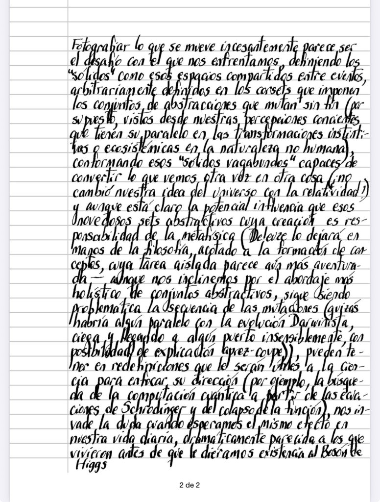 Fotografiar lo que se mueve incesantemente parece ser el desafío con el que nos enfrentamos, definiendo los «sólidos» como esos espacios compartidos entre eventos, arbitrariamente definidos en los corsets que imponen los conjuntos de abstracciones que mutan sin fin (por supuesto, vistos desde nuestras percepciones conscientes que tienen su paralelo en las transformaciones instintivas o ecosistémicas en la naturaleza no humana), conformando esos «sólidos vagabundos» capaces de convertir lo que vemos otra vez en otra cosa (¿no cambió nuestra idea del universo con la relatividad?) y aunque está claro la potencial influencia que esos novedosos sets abstractivos cuya creación es responsabilidad de la metafísica (Deleuze lo dejará en manos de la filosofía, acotado a la formación de conceptos, cuya tarea aislada parece aún más aventurada – aunque nos inclinemos por el abordaje mas holístico de conjuntos abstractivos, sigue siendo problemática la secuencia de las mutaciones (quizá habría algún paralelo con la evolución Darwinista, ciega y llegando a algún puerto insensiblemente, con posibilidad de explicación aprez-coupe)), pueden tener en redefiniciones que le serán útiles a la ciencia para enfocar su dirección (por ejemplo, la búsqueda de la computación cuántica a partir de las ecuaciones de Schrodinger y del colapso de la función), nos invade la duda cuando esperamos el mismo efecto en nuestra vida diaria, dramáticamente parecida a los que vivieron antes de que le diéramos existencia al Bosón de Higgs
