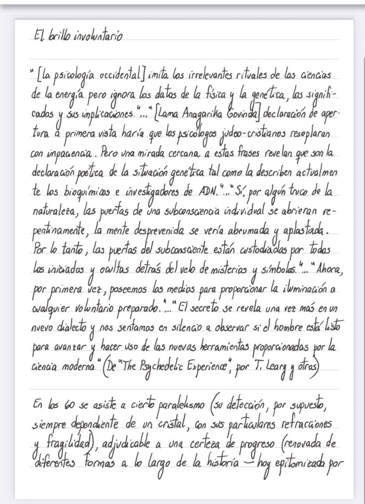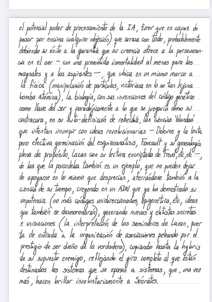 En los 60 se asiste a cierto paralelismo (su detección, por supuesto, siempre dependiente de un cristal, con sus particulares refracciones y fragilidad), adjudicable a una certeza de progreso (renovada de diferentes formas a lo largo de la historia – hoy epitomizada por el potencial poder de procesamiento de la IA, furor que es capaz de pasar por encima cualquier objeción) que arrasa con todo, probablemente debiendo su éxito a la garantía que su creencia ofrece a la perseverancia en el ser – con una prometida inmortalidad al menos para los magnates y a los aspirantes – que ubica en un mismo marco a la física (manipulación de partículas, victoriosa en la no tan lejana bomba atómica), la biología, con sus invenciones del código genético como llave del ser, y paradójicamente lo que se juzgaría como su contracara, en su auto-definición de rebeldía, las ciencias «blandas» que intentan irrumpir con ideas revolucionarias – Deleuze y la lenta pero efectiva germinación del esquizoanálisis, Foucault y su genealogía plena de propósito, Lacan con su lectura encriptada de Freud, etc. – de las que la psicodelia también es un ejemplo, que no pueden dejar de apoyarse en lo mismo que desprecian, aferrándose también a la ciencia de su tiempo, creyendo en un ADN que ya ha demostrado su impotencia (no más códigos unidireccionales, epigenética, etc., ideas que también se desmoronarán), generando nuevos y elitistas secretos e iniciaciones (la interpretación de los seminarios de Lacan, puerta de entrada a la organización de asociaciones peleando por el prestigio de ser dueño de la verdadera), copiando hasta la hybris de su supuesto enemigo, reflejando el giro completo al que están destinados los sistemas que se oponen a sistemas, que, una vez más, hacen brillar involuntariamente a Sócrates.
