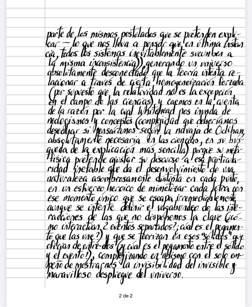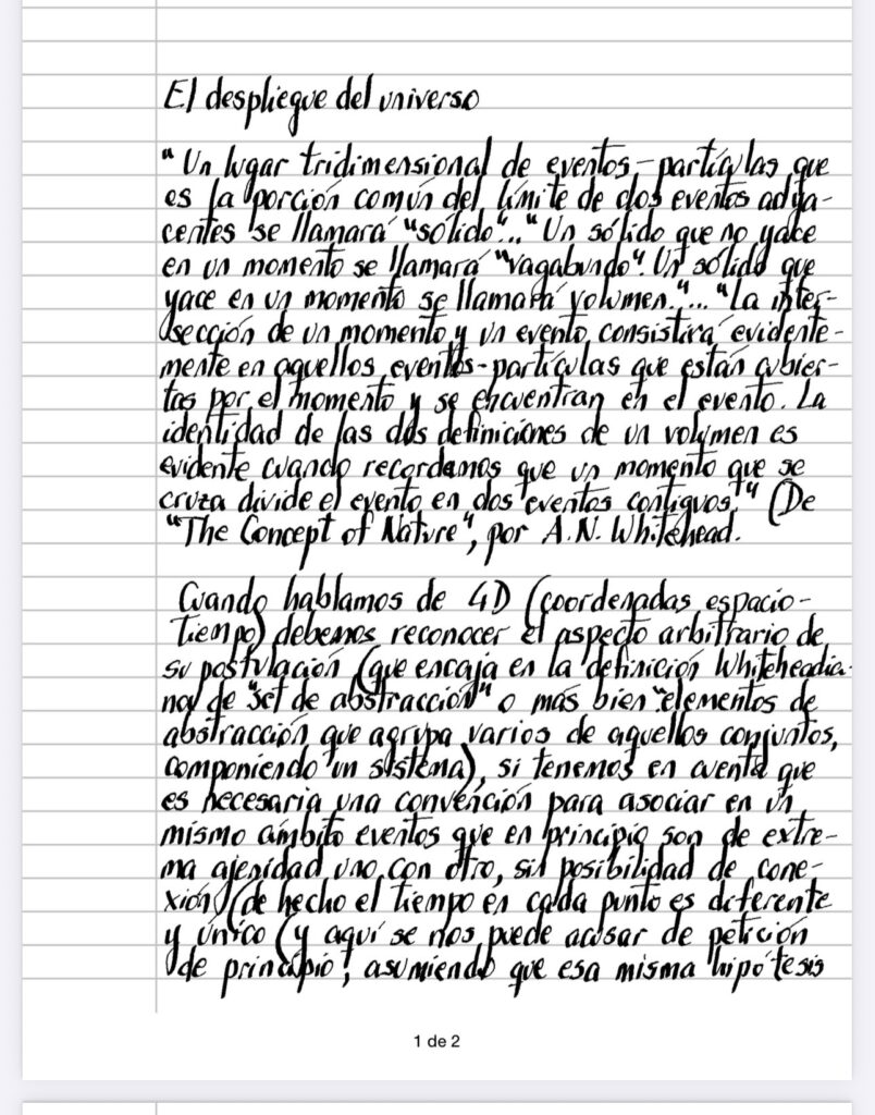 Cuando hablamos de 4D (coordenadas espacio- tiempo) debemos reconocer el aspecto arbitrario de su postulación (que encaja en la definición Whiteheadiana de «set de abstracción» o mas bien «elementos de abstracción” que agrupa varios de aquellos conjuntos, componiendo un sistema), si tenemos en cuenta que es necesaria una convención para asociar en un mismo ámbito eventos que en principio son de extrema ajenidad uno con otro, sin posibilidad de conexión (de hecho el tiempo en cada punto es diferente y único (y aquí se nos puede acusar de petición de principio, asumiendo que esa misma hipótesis parte de los mismos postulados que se pretenden explicar – lo que nos lleva a pensar que en última instancia, todos los sistemas inevitablemente sucumben a la misma inconsistencia)), generando un universo absolutamente desconectado que la teoría intenta relacionar a través de cierta homogeneización forzada (por supuesto que la relatividad no es la excepción en el campo de las ciencias) y caemos en la cuenta de la razón por la cual Whitehead nos inunda de neologismos y conceptos (complejidad que deberíamos desechar si pensáramos según la navaja de Ockham, absolutamente necesaria en las ciencias, en su búsqueda de la explicación más sencilla) porque su metafísica pretende ajustar su discurso a esa particularidad inefable que da el desenvolvimiento de una naturaleza asombrosamente distinta en cada punto, en un esfuerzo heroico de mimetizar cada letra con ese momento único que se escapa irremediablemente aunque se intente definir el vagabundeo de las interacciones de las que no disponemos la clave(¿cómo interactúan 2 eventos separados?¿cúal es el pegamento que las une?) y que se teorizan en esos «sólidos» que ofician de entre-dos(¿y cúal es el pegamento entre el sólido y el evento?), complejizando en abismo con el solo empeño de mostrarnos la invisibilidad del invisible y maravilloso despliegue del universo.