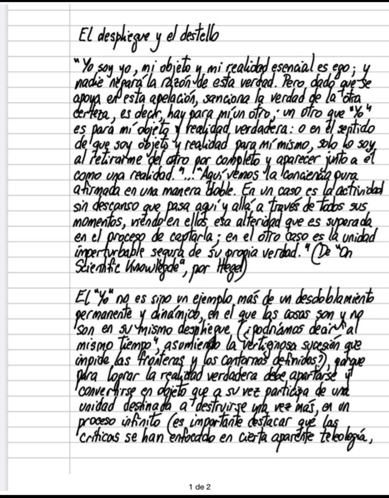 El “Yo” no es sino un ejemplo más de un desdoblamiento permanente y dinámico, en el que las cosas son y no son en su mismo despliegue (¿podríamos decir “al mismo tiempo”, asumiendo la vertiginosa sucesión que impide las fronteras y los contornos definidos?), porque para lograr la realidad verdadera debe apartarse y convertirse en objeto que a su vez participa de una unidad destinada a destruirse una vez más, en un proceso infinito (es importante destacar que las críticas se han enfocado en cierta aparente teleología, encarnada en un supuesto Espíritu Absoluto, meta de todo el proceso, curiosamente pasando por alto la imprescindibilidad de un movimiento que desde siempre ya, regresa al principio), que se extiende en cada paso que damos, permitiéndonos apreciar a la ciencia como el esfuerzo de modelizar el despliegue, renovándolo una y otra vez (más allá de los juicios que intentan resaltar la figura del progreso — seguramente por inconfesables motivos — ¿no nos abren mundos nuevos Aristóteles, Ptolomeo, Kepler, Copérnico, Einstein, con independencia de cualquier obsoleta teoría de la correspondencia?) e inhabilitándonos, con independencia del corte histórico que nos fue dado habitar, encontrar en todas y cada una de aquellas maravillosas aventuras el destello que nos cegará para verlo todo de una sola vez.