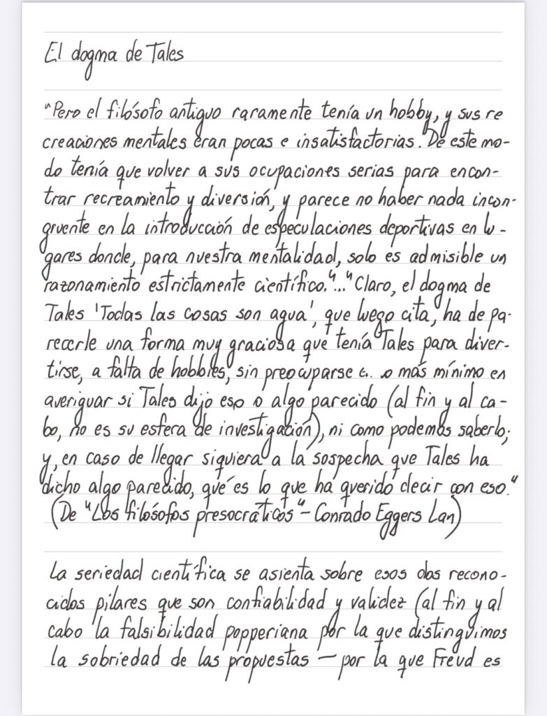 «Pero el filósofo antiguo raramente tenía un hobby, sus recreaciones mentales eran pocas e insatisfactorias. De este modo tenía que volver a sus ocupaciones serias para encontrar recreamiento y diversión, y parece no haber nada incongruente con la introducción de especulaciones deportivas en lugares donde, para nuestra mentalidad, solo es admisible un razonamiento estrictamente científico.»…»Claro, el dogma de Tales ‘Todas las cosas son agua, que luego cita, ha de parecerle una forma muy graciosa que tenía Tales para divertirse, a falta de hobbies, sin preocuparse en lo más mínimo en averiguar si Tales dijo eso o algo parecido (al fin y al cabo, no es su esfera de investigación), ni cómo podemos saberlo; y, en caso de llegar siquiera a la sospecha que Tales ha dicho algo parecido, que es lo que ha querido decir con eso.» (De «Los filósofos presocráticos» – Conrado Eggers Lan)