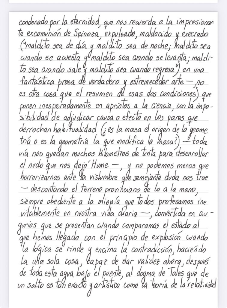 La seriedad científica se asienta sobre esos dos reconocidos pilares que son confiabilidad y validez (al fin y al cabo la falsibilidad popperiana por la que distinguimos la sobriedad de las propuestas – por la gue Freud es condenado por la eternidad, que nos recuerda a la impresionante excomunión de Spinoza, expulsado, maldecido y execrado («maldito sea de día y maldito sea de noche; maldito sea cuando se acuesta y maldito sea cuando se levanta; maldito sea cuando sale y maldito sea cuando regresa”), en una fantástica prosa de verdadero y estremecedor arte – ,no es otra cosa que el resumen de esas dos condiciones que ponen inesperadamente en aprietos a la ciencia, con la imposibilidad de adjudicar causa o efecto en los pares que derrochan habitualidad (es la masa el origen de la geometría o es la geometria la que modifica la masa?) – todavía nos quedan muchos kilómetros de tinta para desenrollar el nudo que nos dejó Hume -, y no podemos menos que horrorizarnos ante la vislumbre que semejante duda nos trae – descontando ef terreno provinciano de lo a la mano, siempre obediente a la miopía que todos profesamos inevitablemente en nuestra vida diaria -, convertida en augurios que se presentan cuando comparamos el estado al que hemos llegado con el principio de explosion cuando la lógica se rinde y encima la contradicción, haciéndola una sola cosa, capaz de dar validez ahora, después de toda esta agua bajo el puente, al dogma de Tales que de un salto es tan exacto y artístico como la teoría de la relatividad.