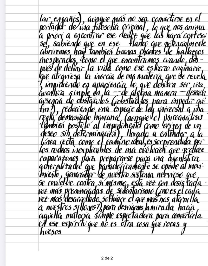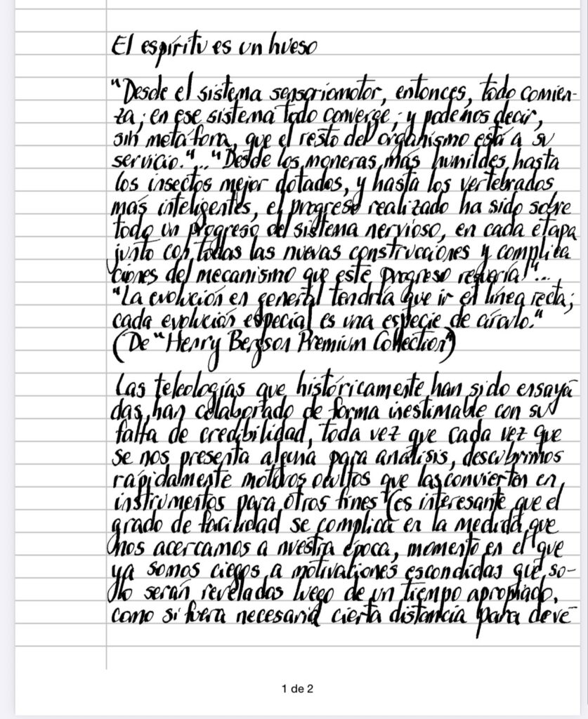 Las teleologías que históricamente han sido ensayadas, han colaborado de forma inestimable con su falta de credibilidad, toda vez que cada vez que se nos presenta alguna para análisis, descubrimos rápidamente motivos ocultos que las convierten en instrumentos para otros fines (es interesante que el grado de facilidad se complica en la medida que nos acercamos a nuestra época, momento en el que ya somos ciegos a motivaciones escondidas que solo serán revelados luego de un tiempo apropiado como si fuera necesaria cierta distancia para develar engaños), aunque más no sea convertirse en el portador de una filosofía original, lo que nos anima a priori a encontrar ese desliz que las hará confesarse, sabiendo que en ese flanco que potencialmente abriremos hay también buenas chances de hallazgos inesperados, como el que encontramos cuando, después de definir la vida como ese esfuerzo originario que atraviesa la inercia de una materia que se revela , impidiendo en apariencia lo que debiera ser una aventura simple en la – de alguna manera – deseada ausencia de obstáculos (¿obstáculos para impedir qué fin?), reduciendo una especie de ley universal a una regla demasiado humana (aunque el psicoanálisis. también postuló al impedimento como origen de un deseo sin determinación), llevado, a entender a la línea recta como el camino ideal, es sorprendida por los rodeos inexplicables de una evolución que produce caparazones para prepararse para una agonística generalizada que paradójicamente se opone al movimiento, generador de nuestro sistema nervioso que se revuelve contra sí mismo, esta vez con dosis cada vez mas pronunciadas de sedentarismo (¿no es el cada vez más desarrollado software el que más nos atornilla a nuestros sillones?), para desviarnos la mirada hacia aquella materia simple espectadora para convertirla en ese espíritu que no es otra cosa que rocas y huesos.