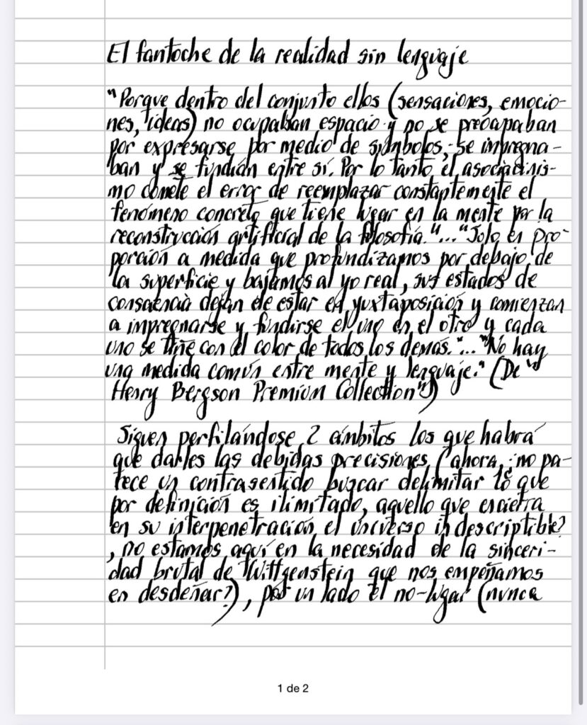 Siguen perfilándose 2 ámbitos a los que habrá que darles las debidas precisiones (ahora, ¿no parece un contrasentido buscar delimitar lo que por definición es ilimitado, aquello que encierra en su interpenetración el universo indescriptible? , no estamos aquí en la necesidad de la sinceridad brutal de Wittgenstein que nos empeñamos en desdeñar?), por un lado el no-lugar (nunca mejor dicho, en su independencia absoluta del espacio) en donde reina la duración, que aborrece el principio de no contradicción (no es casual que aquí el villano sea el espacio – aunque, si quisiémos (y no queremos) ser justificados por la ciencia, estaríamos en problemas con la fórmula probabilística del principio de indeterminación de Heisenberg), en una lógica distinta que nos recuerda a Hegel, aunque la manera de rescatarlo de su sombra y confusión se presenta absolutamente diferente, si pensamos que para Bergson, es el otro ámbito, el del lenguaje el traidor responsable del mundo aparente, de esa Maya que nos hace perseguir fantasmas, proponiendo acceso directo a la verdad enmascarada con promesa de curación (no es casual cierta veneración de Bergson por la hipnosis y el alejamiento crucial de esa disciplina por Freud al momento de la inauguración de su saber), integrando lo que el lenguaje ha separado a la vida misma que hemos disecado con nuestros vanos con conceptos que han sustitudo a la realidad, mientras que para Hegel (siempre mas cercano al psicoanálisis) son los conceptos mismos los imprescindibles para desenvolver una verdad, que sin ellos, es pura fantochada.