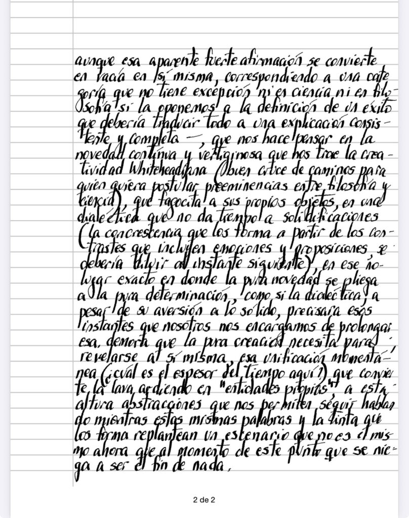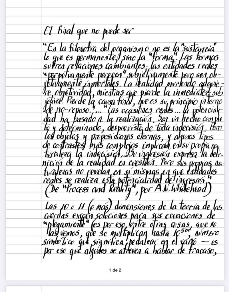 Las 10 u 11 (o más) dimensiones de la teoría de las cuerdas exigen soluciones para sus ecuaciones de «plegamiento» (es por eso, entre otras cosas, que no las vemos, que se multiplican hasta 10^500, número simbólico que significa pedalear en el vacío – es por eso que algunos se atreven a hablar de fracaso, aunque esa aparente fuerte afirmación se convierte en vacía en sí misma, correspondiendo a una categoría que no tiene excepción ni en ciencia ni en filosofía si la oponemos a la definición de un éxito que debería traducir todo a una explicación consistente y completa -, que nos hace pensar en la novedad contínua y vertiginosa que nos trae la creatividad Whiteheadiana (buen cruce de caminos para quien quiera postular preeminencias entre filosofía y ciencia), que fagocita a sus propios objetos, en una dialéctica que no da tiempo a solidificaciones (la concrescencia que los forma a partir de los contrastes que incluyen emociones y proposiciones, se debería diluir al instante siguiente), en ese no-lugar exacto en donde la pura novedad se pliega a la pura determinación, como si la dialéctica, a pesar de su aversión a lo sólido, precisara esos instantes que nosotros nos encargamos de prolongar esa demora que la pura creación necesita para revelarse a sí misma, esa unificación momentánea (¿cuál es el espesor del tiempo aquí?) que convierte la lava ardiendo en «entidades propias», a esta altura abstracciones que nos permiten seguir hablando mientras estas mismas palabras y la tinta que los forma replantean un escenario que no es el mismo ahora que al momento de este punto que se niega a ser el fin de nada.
