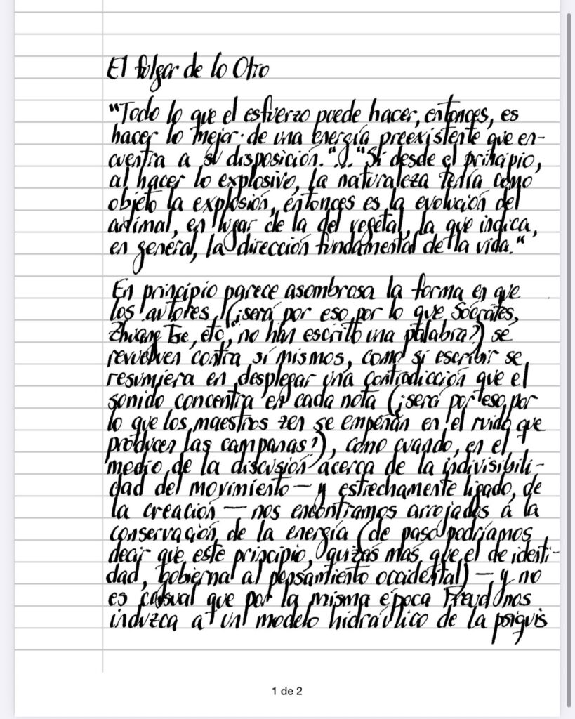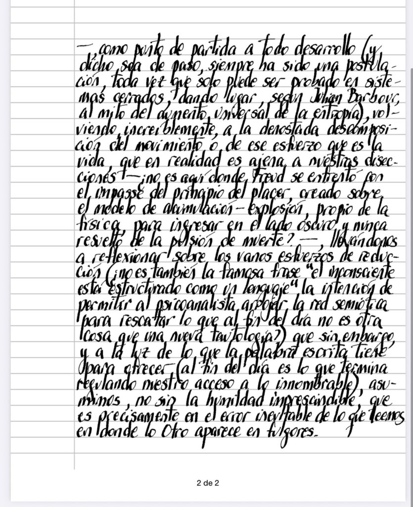 En principio parece asombrosa la forma en que. los autores (¿será. por eso por lo que Sócrates, Zhuang Tse, etc, no han escrito una palabra?) se revuelven contra sí mismos, como si escribir se resumiera en desplegar una contradicción que el sonido concentra en cada nota (será por eso por lo que los maestros zen se empeñan en el ruido que producen las campanas?), como cuando, en el medio de la discusión acerca de la indivisibilidad del movimiento – y estrechamente ligado, de la creación – nos encontramos arrojados a la conservación de la energía (de paso podríamos decir que este principio, quizá mas que el de identidad, gobierna al pensamiento occidental) – y no es casual que por la misma época Freud nos induzca a un modelo hidráulico de la psiquis – como punto de partida a todo desarrollo (y dicho sea de paso, siempre ha sido una postulación, toda vez que solo puede ser probado en sistemas cerrados, dando lugar, segun Julian Barbour, al mito del aumento universal de la entropía), volviendo, increíblemente, a la denostada descomposición del movimiento o de ese esfuerzo que es la vida, que en realidad es ajena a nuestras disecciones – ¿no es aquí donde Freud se enfrentó con el impasse del principio del placer, creado sobre el modelo de acumulación-explosión, propio de la física, para ingresar en el lado oscuro y nunca resuelto de ‘la pulsión de muerte? -, llevándonos a reflexionar sobre los vanos esfuerzos de reducción (¿no es también la famosa frase «el inconsciente está estructurado como un lenguaje» la intención de permitir al psicoanalista arrojar la red semiótica para rescatar lo que al fin del día no es otra cosa que una nueva tautología?) que sin embargo, y a la luz de lo que la palabra escrita tiene para ofrecer (al fin del día es lo que termina regulando nuestro acceso a lo innombrable), asumimos, no sin la humildad imprescindible, que es precisamente en el error inevitable de lo que leemos en donde lo Otro aparece en fulgores.