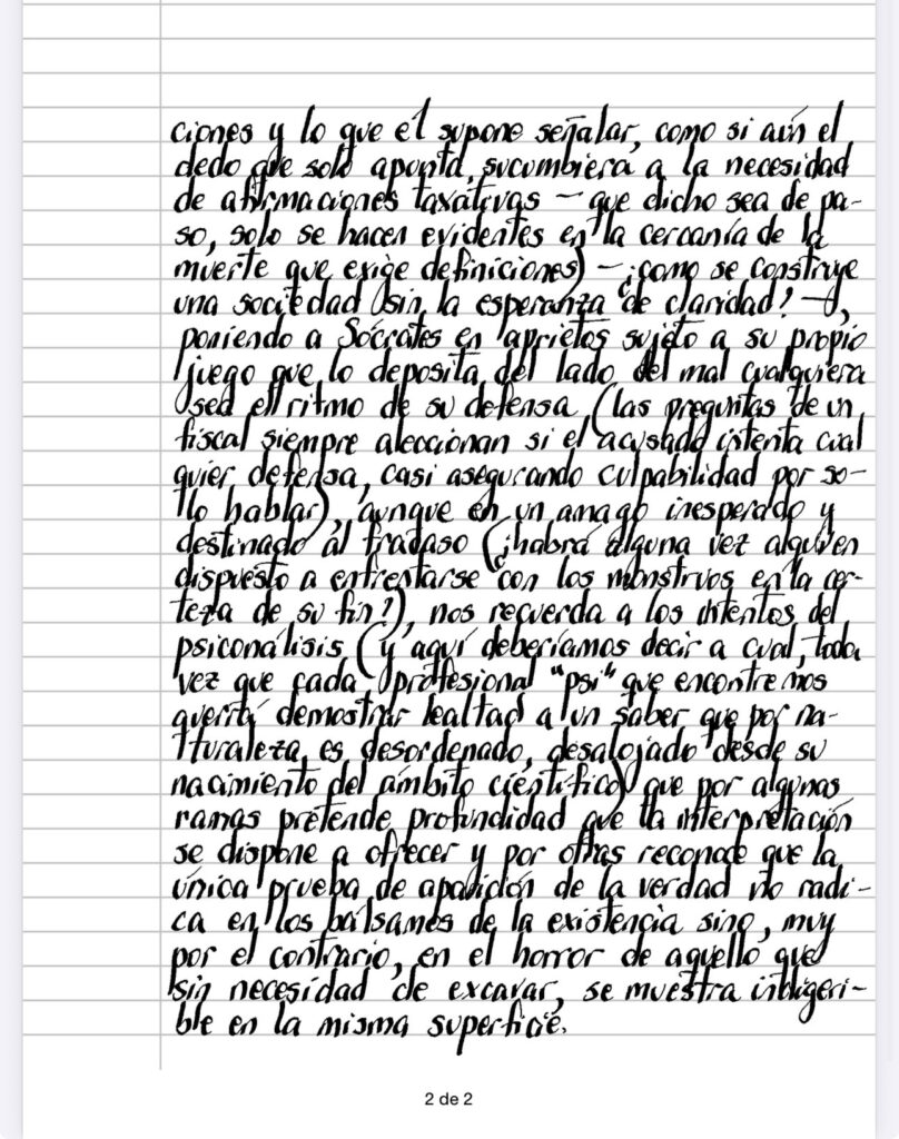A decir verdad, deberíamos conceder mérito a la dupla Anito/Meleto en su función de guardianes de la perseverancia de Atenas, tornándose odiosos en los «buenos» ciudadanos (categoría que nos abarca en su recorrida histórica), solo para proteger el entusiasmo de la juventud, puesto en juego en el escepticismo que la imposibilidad de saber genera, que en apariencia y contra su voluntad, Sócrates desparrama (es interesante acá la disonancia entre la interpretación de sus afirmaciones y lo que él supone señalar, como si aún el dedo que solo apunta, sucumbiera a la necesidad de afirmaciones taxativas – que dicho sea de paso, solo se hacen evidentes en la cercanía de la muerte que exige definiciones) – ¿como se construye una sociedad sin la esperanza de claridad? – , poniendo a Sócrates en aprietos sujeto a su propio juego que lo deposita del lado del mal cualquiera sea el ritmo de su defensa (las preguntas de un fiscal siempre aleccionan si el acusado intenta cualquier defensa, casi asegurando culpabilidad por solo hablar), aunque en un amago inesperado y destinado al fracaso (¿habrá alguna vez alguien dispuesto a enfrentarse con los monstruos en la certeza de su fin?), nos recuerda a los intentos del psicoanálisis (y aquí deberíamos decir a cual, toda vez que cada profesional «psi» que encontremos querrá demostrar lealtad a un saber que por naturaleza es desordenado, desalojado desde su nacimiento del ámbito científico) que por algunas ramas pretende profundidad que la interpretación se dispone a ofrecer y por otras reconoce que la única prueba de aparición de la verdad no radica en los bálsamos de la existencia sino, muy por el contrario, en el horror de aquello que sin necesidad de excavar, se muestra indigerible en la misma superficie.