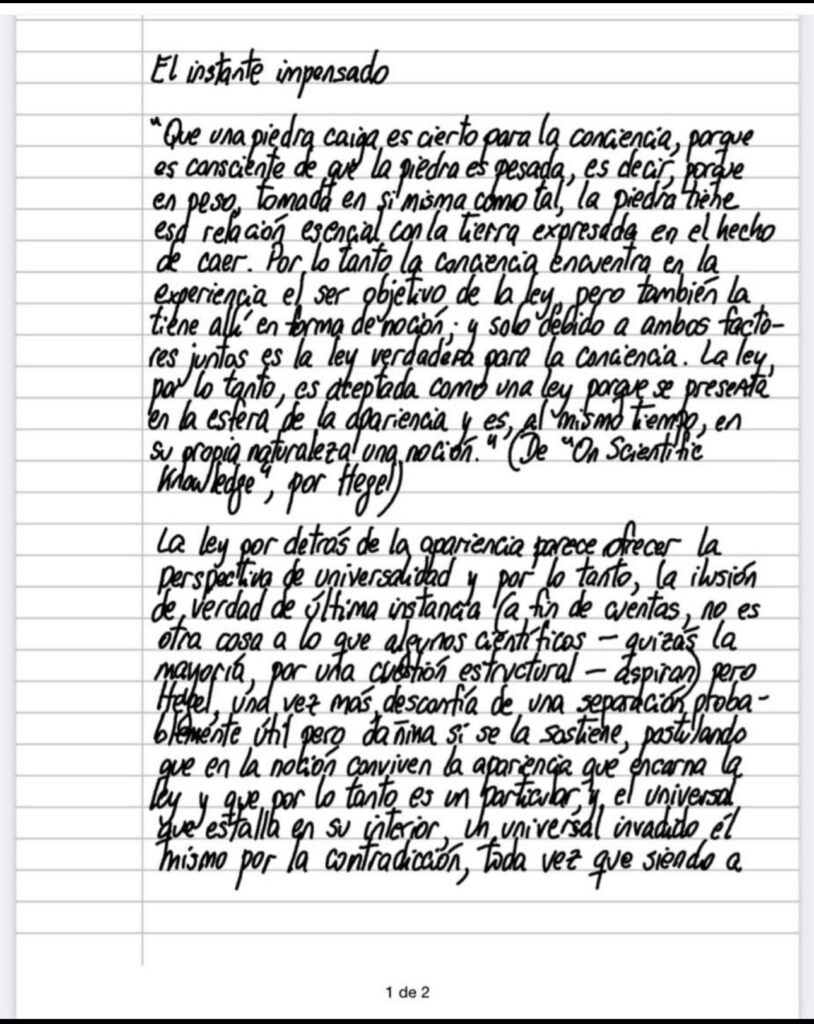 ​“Que una piedra caiga es cierto para la conciencia, porque es consciente de que la piedra es pesada, es decir, porque en peso, tomada en sí misma como tal, la piedra tiene esa relación esencial con la tierra expresada en el hecho de caer. Por lo tanto la conciencia encuentra en la experiencia el ser objetivo de la ley, pero también la tiene allí en forma de noción; y solo debido a ambos factores juntos es la ley verdadera para la conciencia. La ley, por lo tanto, es aceptada como una ley porque se presenta en la esfera de la apariencia y es, al mismo tiempo, en su propia naturaleza una noción.” (De “On Scientific Knowledge”, por Hegel).