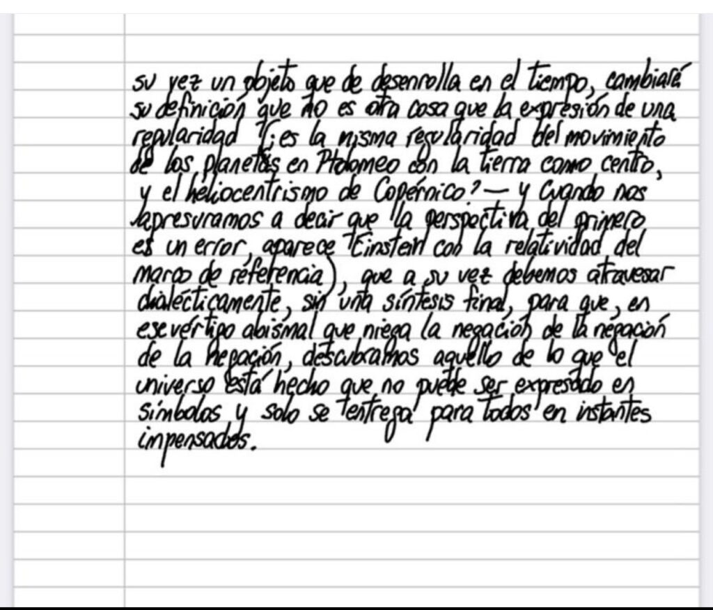 ​La ley por detrás de la apariencia parece ofrecer la perspectiva de universalidad y por lo tanto, la ilusión de verdad de última instancia (a fin de cuentas, no es otra cosa a lo que algunos científicos — quizás la mayoría, por una cuestión estructural — aspiran) pero Hegel, una vez más, desconfía de una separación probablemente útil pero dañina si se la sostiene, postulando que en la noción conviven la apariencia que encarna la ley y que por lo tanto es un particular, y el universal que estalla en su interior, un universal invadido él mismo por la contradicción, toda vez que siendo a su vez un objeto que se desarrolla en el tiempo, cambiará su definición que no es otra cosa que la expresión de una regularidad (¿es la misma regularidad del movimiento de los planetas en Ptolomeo con la Tierra como centro, y el heliocentrismo de Copérnico? — y cuando nos apresuramos a decir que la perspectiva del primero es un error, aparece Einstein con la relatividad del marco de referencia), que a su vez debemos atravesar dialécticamente, sin una síntesis final, para que, en ese vértigo abismal que niega la negación de la negación de la negación, descubramos aquello de lo que el universo está hecho que no puede ser expresado en símbolos y solo se entrega para todos en instantes impensados.