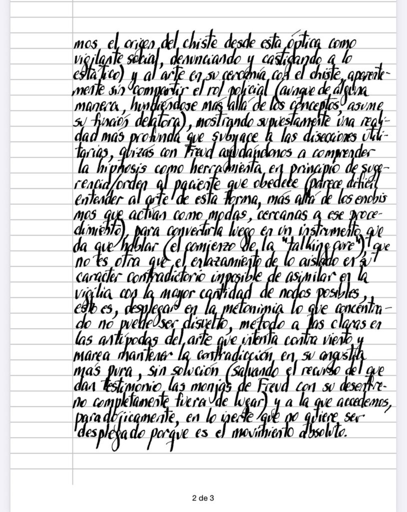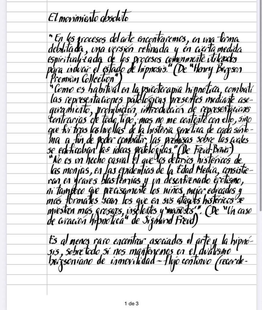Es al menos raro encontrar asociados el arte y la hipno­sis, sobretodo si nos mantenemos en el dualismo bergsoniano de inmovilidad-flujo continuo (recordemos el origen del chiste desde esta óptica como vigilante social, denunciando y castigando a lo estático) y al arte en su cercanía con el chiste, aparente­mente sin compartir el rol policial (aunque de alguna manera, hundiéndose más allá de los conceptos, asume su función delatora), mostrando supuestamente una reali­dad más profunda que subyace a las disecciones utili­tarias, quizás con Freud ayudándonos a comprender la hipnosis como herramienta en principio de suge­rencia/orden al paciente que obedece (parece difícil entender al arte de esta forma, más allá de los esnobismos que actúan como modas, cercanas a ese proce­dimiento), para convertirla luego en un instrumento que da que hablar (el comienzo de la» talking cure»), que no es otra que el enlazamiento de lo aislado en su caracter contradictorio imposible de asimilar en la vigilia con la mayor cantidad de nodos posibles, esto es, desplegar en la metonimia lo que concentra­do no puede ser disuelto, método a las claras en las antípodas del arte que intenta contra viento y marea mantener la contradicción en su angustia más pura, sin solución (salvando el recurso del que dan testimonio las monjas de Freud con su desenfre­no completamente fuera de lugar) y a la que accedemos, paradójicamente, en lo inerte que no quiere ser desplegado porque es el movimiento absoluto.