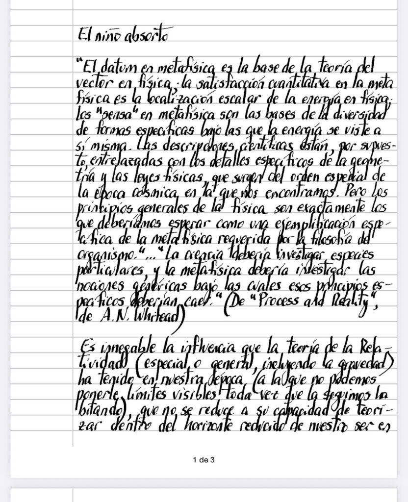 «El datum en metafísica es la base de la teoría del vector en física; la satisfacción cuantitativa en la meta física es la localización escalar de la energía en física; los «sensa» en metafísica son las bases de la diversidad de formas específicas bajo las que la energía se viste a sí misma. Las descripciones científicas están, por supuesto, entrelazadas con los detalles específicos de la geometría y las leyes físicas, que surgen del orden especial de la época cósmica en la que nos encontramos. Pero los principios generales de la física son exactamente los que deberíamos esperar como una ejemplificación específica de la metafísica requerida por la filosofía del organismo.»…»La ciencia debería investigar especies particulares, y la metafísica debería investigar las nociones genéricas bajo las cuales esos principios específicos deberían caer.» (De» Process and Reality», de A. N. Whitead)