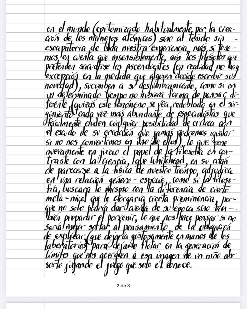 Es innegable la influencia que la teoría de la Relatividad (especial o general, incluyendo la gravedad) ha tenido en nuestra época (a la que no podemos ponerle límites visibles toda vez que la seguimos habitando), que no se reduce a su capacidad de teorizar dentro del horizonte reducido de nuestro ser en el mundo (epitomizado habitualmente por la creación de los manejos atómicos) sino al teñido sin escapatoria de toda nuestra experiencia, más si tenemos en cuenta que insensiblemente, aún los filósofos que pretenden sacudirse los ascendientes (en realidad no hay excepción en la medida que alguien decide escribir su novedad), sucumben a su deslumbramiento, como si en un determinado tiempo no hubiera forma de pensar diferente (quizá este fenómeno se vea redoblado en el surgimiento cada vez más abundante de especialistas que fácilmente eluden cualquier posibilidad de crítica con el escudo de su erudición que jamas podremos igualar si no nos convertimos en uno de ellos), lo que pone nuevamente en juicio el papel de la filosofía en contraste con la ciencia, que Whitehead, en su afán de parecerse a la física de nuestro tiempo, adjudica en una relación genero-especie, como si la filosofía buscara lo mismo con la diferencia de cierto.