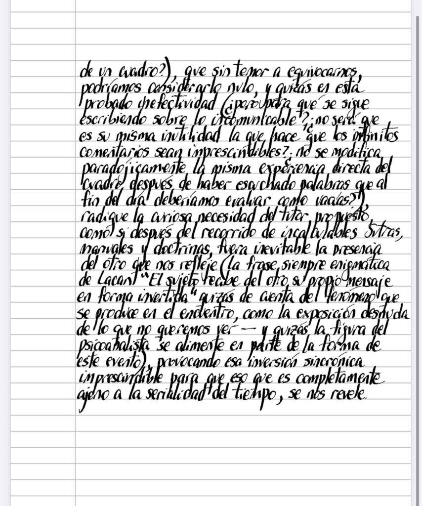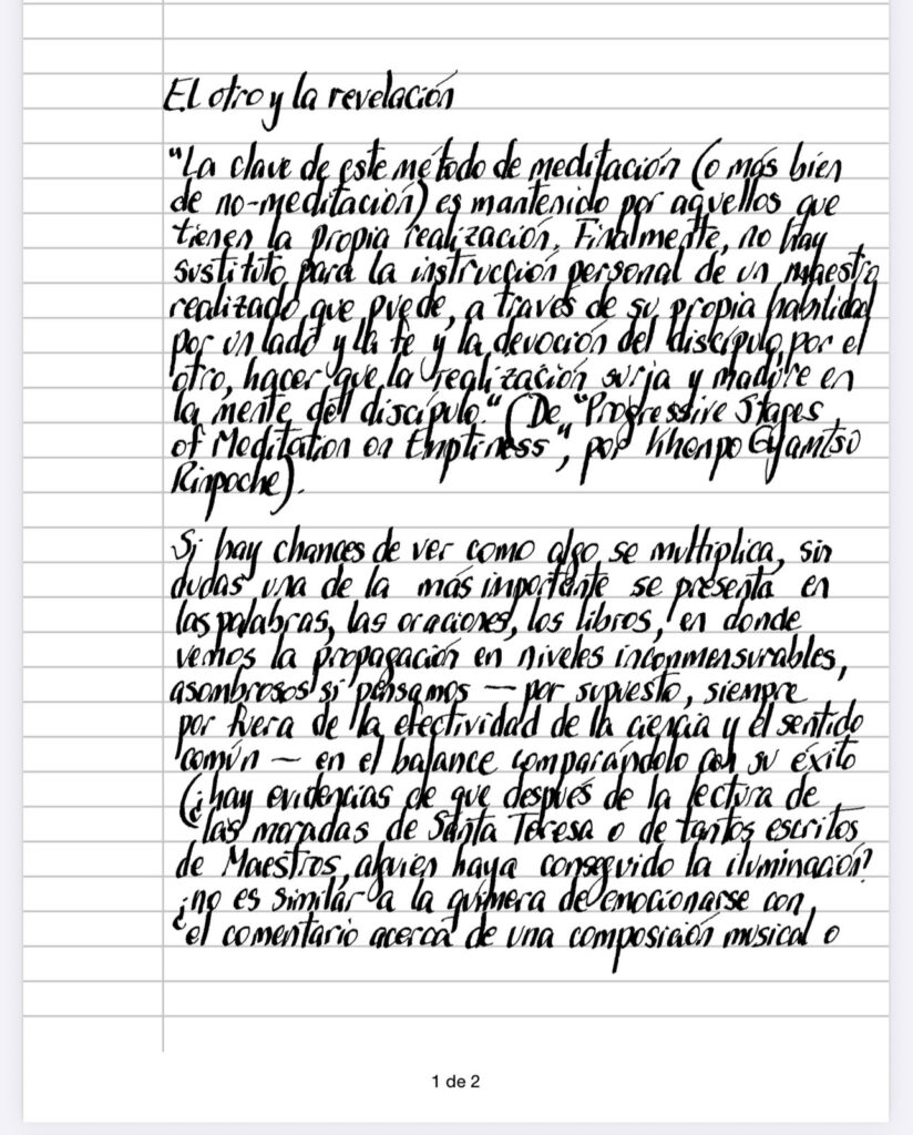 las moradas de Santa Teresa o de tantos escritos de Maestros, alguien haya conseguido la iluminación?¿no es similar a la quimera de emocionarse con el comentario acerca de una composición musical o de un cuadro?), que sin temor a equivocarnos, podríamos considerarlo nulo, y quizás en esta probada inefectividad (¿pero para qué se sigue escribiendo sobre lo incomunicable?¿no será que es su misma inutilidad la que hace que los infinitos comentarios sean imprescindibles?¿no se modifica paradójicamente la misma experiencia directa del cuadro después de haber escuchado palabras que al fin del día deberíamos evaluar como vacías?), radique la curiosa necesidad del tutor propuesto, como si después del recorrido de incalculables sutras, manuales y doctrinas, fuera inevitable la presencia del otro que nos refleje (la frase siempre enigmática de Lacan «El sujeto recibe del otro su propio mensaje en forma invertida» quizás de cuenta del fenómeno que se produce en el encuentro, como la exposición desnuda de lo que no queremos ver – y quizás la figura del psicoanalista se alimente en parte de la forma de este evento), provocando esa inversión sincrónica imprescindible para que eso que es completamente ajeno a la serialidad del tiempo, se nos revele.