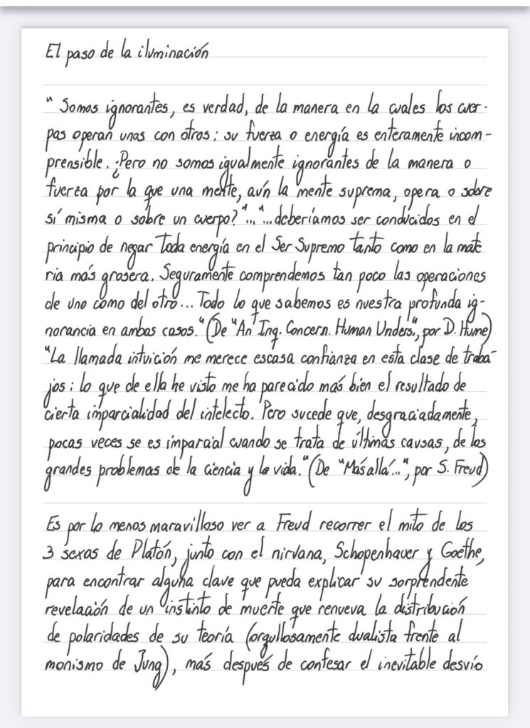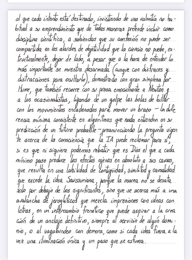 Es por lo menos maravilloso ver a Freud recorrer el mito de los tres sexos de Platón, junto con Schopenhauer y Goethe, para encontrar alguna clave que pueda explicar su sorprendente revelación de un instinto de muerte que renueva la distribución de polaridades de su teoría (orgullosamente dualista frente al monismo de Jung), más después de confesar el inevitable desvío al que cada intento está destinado, invistiendo de una valentía no habitual a su emprendimiento que de todas maneras pretende incluir como disciplina científica, a sabiendas que su confesión no puede ser compartida en los alardes de objetividad que la ciencia no puede, estructuralmente, dejar de lado, a pesar que a la hora de entender lo más importante se muestra desarmada (aunque con disfraces y distracciones para ocultarlo), demostrado con gran simpleza por Hume, que también recorre con su prosa emocionante a Newton y a los ocasionalistas, ligando de un golpe las bolas de billar con los movimientos encadenados para mover un brazo – la diferencia mínima consistente en algoritmos que nada entienden en su predicción de un futuro probable — preanunciando la pregunta vigente acerca de la consciencia que la IA puede reclamar para sí, si es que ni siquiera podemos rebatir en absoluto, que es Dios el que a cada mínimo paso produce los efectos ajenos a sus causas, que resulta en una labilidad de contigüidad, similitud y causalidad que excede la idea saussuriana, porque la marea no se ve solo por debajo de los significantes, sino que se acerca más a una avalancha de jeroglíficos que mezcla impresiones con letras, ideas con imágenes, en un intercambio frenético que puede aspirar a la creación de un anclaje definitivo, siempre al servicio de algún dominio, o al vagabundeo con demora, como si cada idea fuera a la vez una iluminación única y un paso que se esfuma.
