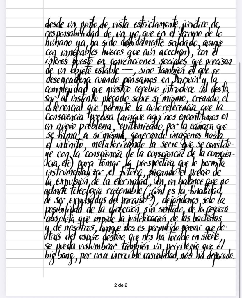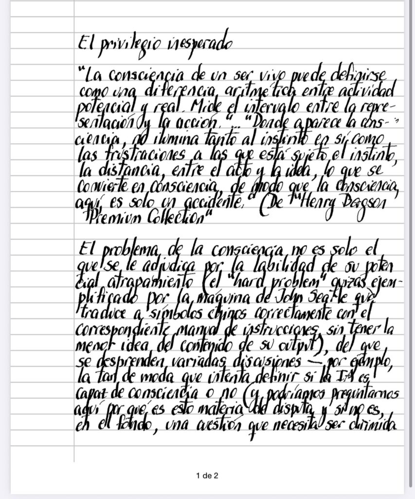 El problema de la consciencia no es solo el que se le adjudica por la labilidad de su potencial atrapamiento (el «hard problem» quizas emplificado la máquina de John Searle que traduce a símbolos chinos correctamente con el correspondiente manual de instrucciones, sin tener la menor idea del contenido de su output), del que se desprenden variadas discusiones – por ejemplo, la tan de moda que intenta definir si la IA es capaz de consciencia o no (y podríamos preguntarnos aquí por qué es esto materia de disputa y si no es, en el fondo, una cuestión que necesita ser dirimida desde un punto de vista estrictamente jurídico de responsabilidad de un yo que en el terreno de lo humano ya ha sido debidamente saldado, aunque con innegables huecos que aún acechan), con el interés puesto en convenciones sociales que precisan de un objeto estable – sino también el que se desencadena cuando pensamos en Darwin y la complejidad que nuestro cerebro introduce al desfasar al instinto plegado sobre sí mismo, creando el diferencial que permite la auto referencia que la consciencia precisa (aunque aquí nos encontramos en un nuevo problema, epitomizado por la cámara que se filma a sí misma, generando imágenes hasta el infinito, metaforizando la serie que se constituye con la consciencia de la consciencia de la etc) para tomar la perspectiva que le permita instrumentalizar el futuro, pagando el precio de la expulsión de la eternidad, en un balance que no admite teleología razonable (¿cúal es la finalidad de ser expulsados del paraíso?), dejándonos solo la posibilidad de la dirección sin sentido, de la ceguera absoluta que impide la justificación de las bacterias y de nosotros, aunque nos es permitido pensar que detrás del oscuro destino que nos ha tocado en suerte, se pueda vislumbrar también un privilegio que el big bang, por una increíble casualidad, nos ha deparado.