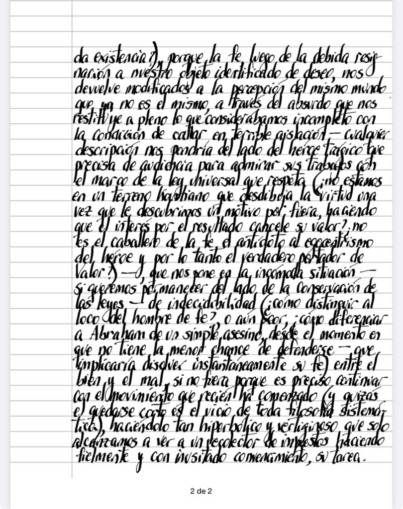 El mal, nos han enseñado, puede tener su origen en la banalidad – conclusión que, contra todo pronóstico, nos aterroriza aún más que su individuación -, que sorprendentemente extiende su alcance a la misma iluminación, con consecuencias más que importantes (para no detenernos en el fin de los charlatanes que pretenden guiarnos después de nuestra correspondiente paga, porque el sendero ya deja de ser público y comunicable – ¿cómo se podría enseñar lo que no puede ser dicho. y esta exiliado en una gris y aislada existencia?), porque la fe, luego de la debida resignación a nuestro objeto identificado de deseo, nos devuelve modificados a la percepción del mismo mundo que ya no es el mismo, a través del absurdo que nos restituye a pleno lo que considerábamos incompleto con la condición de callar en terrible aislación – cualquier descripción nos pondría del lado del héroe trágico que precisa de audiencia para admirar sus trabajos con el marco de la ley universal que respeta (¿no estamos en un terreno kantiano que desdibuja la virtud una vez que le descubrimos un motivo por fuera, haciendo que el interés por el resultado cancele su valor?¿no es el caballero de la fe el antídoto al egocentrismo del héroe y por lo tanto el verdadero portador de Valor?) -, que nos pone en la incómoda situación – si queremos permanecer del lado de la conservación de las leyes – de indecidibilidad (¿cómo distinguir al loco del hombre de fe?, o aún peor, ¿cómo diferenciar a Abraham de un simple asesino, desde el momento en que no tiene la menor chance de defenderse – que implicaría disolver instantáneamente su fe) entre el bien y el mal, si no fuera porque es preciso continuar con el movimiento que recién ha comenzado (y quizá el quedarse corto es el vicio de toda filosofía sistemática), haciendolo tan hiperbólico y vertiginoso que solo alcanzamos a ver a un recolector de impuestos haciendo fielmente y con inusitado convencimiento, su tarea.