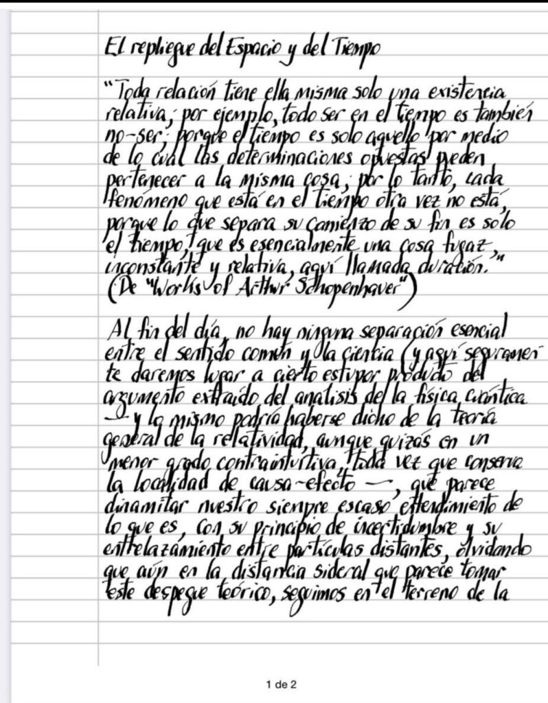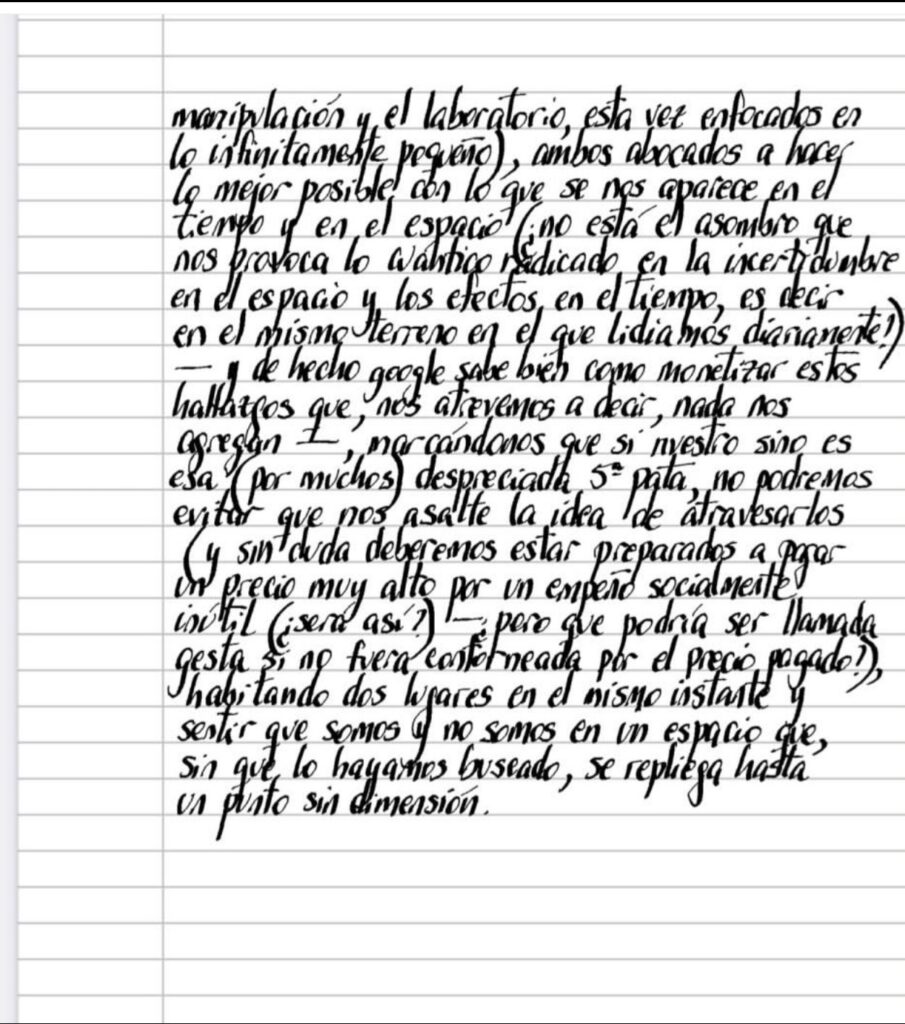 Al fin del día, no hay ninguna separación esencial entre el sentido común y la ciencia (y aquí seguramente daremos lugar a cierto estupor producido del argumento extraído del análisis de la física cuántica y lo mismo podría haberse dicho de la teoría general de la relatividad, aunque quizás en un menor grado contraintuitiva, toda vez que conserva la localidad de causa-efecto—, que parece dinamitar nuestro siempre escaso entendimiento de lo que es, con su principio de incertidumbre y su entrelazamiento entre partículas distantes, olvidando que aún en la distancia sideral que parece tomar este despegue teórico, seguimos en el terreno de la manipulación y el laboratorio, esta vez enfocados en lo infinitamente pequeño), ambos abocados a hacer lo mejor posible con lo que se nos aparece en el tiempo y en el espacio (¿no está el asombro que nos provoca lo cuántico radicado en la incertidumbre en el espacio y los efectos en el tiempo, es decir en el mismo terreno en el que lidiamos diariamente?) — y de hecho google sabe bien como monetizar estos hallazgos que, nos atrevemos a decir, nada nos agregan—, marcándonos que si nuestro sino es esa (por muchos) despreciada 5ª pata, no podremos evitar que nos asalte la idea de atravesarlos (y sin duda deberemos estar preparados a pagar un precio muy alto por un empeño socialmente inútil (¿será así? — pero ¿qué podría ser llamada gesta si no fuera contorneada por el precio pagado?), habitando dos lugares en el mismo instante y sentir que somos y no somos en un espacio que, sin que lo hayamos buscado, se repliega hasta un punto sin dimensión.
