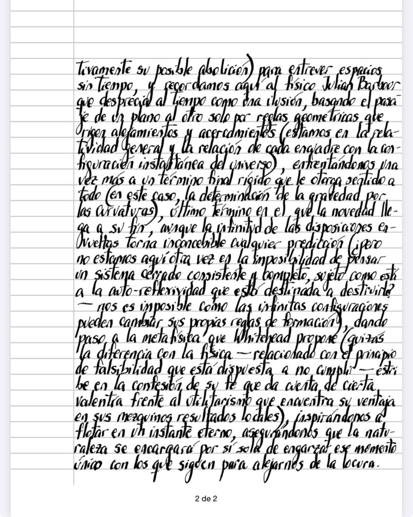La ciencia ficción (es curiosa la dificultad de predecir quien abre el camino para una nueva especulación, algunas veces la ficción pidiendo ayuda a la física y otras veces, la física inspirada por la ficción) nos ha facilitado la imaginación (sobretodo con el advenimiento del cine, que aún en su variante digital, no deja de ser un exponente privilegiado del tiempo, demostrándonos performativamente su posible abolición) para entrever espacios sin tiempo, y recordamos aquí al físico Julian Barbour que desprecia al tiempo como una ilusión, basando el pasaje de un plano al otro solo por reglas geométricas que rigen alejamientos y acercamientos (estamos en la relatividad general y la relación de cada encuadre con la configuración instantánea del universo), enfrentándonos una vez más a un término final rígido que le otorga sentido a todo (en este caso, la determinación de la gravedad por las curvaturas), último término en el que la novedad llega a su fin, aunque la infinitud de las disposiciones envueltas torna inconcebible cualquier predicción (¿pero no estamos aqui otra vez en la imposibilidad de pensar un sistema cerrado consistente y completo, sujeto como está a la auto-reflexividad que está destinada a destruirlo? – nos es imposible como las infinitas configuraciones pueden cambiar sus propias reglas de formación), dando paso a la metafísica que Whitehead propone (quizás la diferencia con la física – relacionado con el principio de falsibilidad que está dispuesta a no cumplir – estribe en la confesión de su fe que da cuenta de cierta valentía frente al utilitarismo que encuentra su ventaja en sus mezquinos resultados locales), inspirándonos a flotar en un instante eterno, asegurándonos que la naturaleza se encargará por sí sola de engarzar ese momento único con los que siguen para alejarnos de la locura.