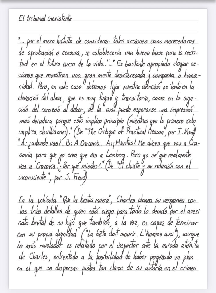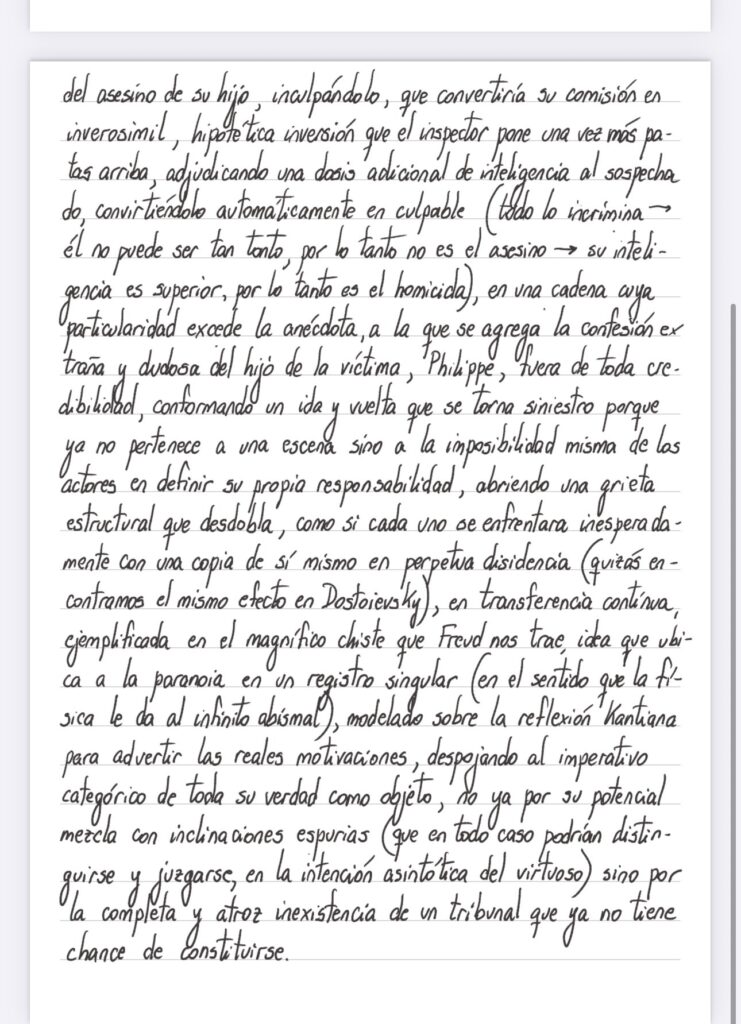 En la película “Que la bestia muera”, Charles planea su venganza con los fríos detalles de quien está ciego para todo lo demás por el asesinato brutal de su hijo que también, a la vez, es capaz de terminar con su propia dignidad (“La bête doit mourir. L’homme aussi”), aunque lo más revelador es relatado por el inspector ante la mirada atónita de Charles enfrentado a la posibilidad de haber pergeñado un plan en el que se dispersan pistas tan claras de su autoría en el crimen del asesino de su hijo inculpándolo, que convertiría su comisión en inverosímil, hipotética inversión que el inspector pone una vez más patas arriba, adjudicando una dosis adicional de inteligencia al sospechado convirtiéndolo automáticamente en culpable (todo lo incrimina → él no puede ser tan tonto, por lo tanto no es el asesino → su inteligencia es superior, por lo tanto es el homicida), en una cadena cuya particularidad excede la anécdota a la que se agrega la confesión extraña y dudosa del hijo de la víctima, Philippe, fuera de toda credibilidad, conformando un ida y vuelta que se torna siniestro porque ya no pertenece a una escena sino a la imposibilidad misma de los actores en definir su propia responsabilidad, abriendo una grieta estructural que desdobla, como si cada uno se enfrentara inesperadamente con una copia de sí mismo en perpetua disidencia (quizás encontramos el mismo efecto en Dostoievsky), en transferencia continua ejemplificada en el magnífico chiste que Freud nos trae, idea que ubica a la paranoia en un registro singular (en el sentido que la física le da al infinito abismal), modelado sobre la reflexión kantiana para advertir las reales motivaciones, despojando al imperativo categórico de toda su verdad como objeto, no ya por su potencial mezcla con inclinaciones espurias (que en todo caso podrían distinguirse y juzgarse, en la intención asintótica del virtuoso) sino por la completa y atroz inexistencia de un tribunal que ya no tiene chance de constituirse.