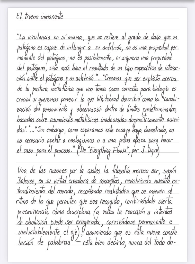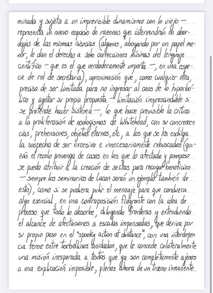 Una de las razones por la cuales la filosofía merece ser, según Deleuze, es su virtud creadora de conceptos, revolviendo nuestro entendimiento del mundo, recortando realidades que se mueven al ritmo de lo que permiten que sea recogido, confiriéndole cierta preeminencia como disciplina (a veces la reacción a intentos de abolición puede ser exagerada, corriéndose permanente e ineluctablemente el eje), asumiendo que es esta nueva constelación de palabras – está bien decirlo, nunca del todo dominada y sujeta a un imprevisible dinamismo – representa un nuevo espacio de razones que intervendrán en abordajes de las mismas ciencias (algunas, abogando por un papel menor, le dan el derecho a solo correcciones mínimas del lenguaje científico – que es el que verdaderamente importa -, en una especie de rol de secretaria), aproximación que, como cualquier otra, precisa de ser limitada para no ingresar al caos de lo hiperbólico y agotar su propia propuesta – limitación imprescindible si se pretende hacer sistema -, lo que hace previsible la crítica a la proliferación de neologismos de Whitehead, con su concrescencias, prehensiones, objetos eternos, etc., a los que se les endilga la sospecha de ser excesiva e innecesariamente rebuscados (quizás el recelo provenga de casos en los que lo afectado y pomposo se pueda atribuir a la creación de sectas para recoger beneficios – siempre los seminarios de Lacan serán un ejemplo también de esto), como si se pudiera pulir el mensaje para que conduzca a algo esencial, en una contraposición flagrante con la idea de proceso que todo lo absorbe, diluyendo fronteras y extendiendo el alcance de afectaciones a escalas impensadas, que deriva por su propio peso en el «spooky action at distance», con una interdependencia feroz entre torbellinos anidados, que le concede colateralmente una misión inesperada a textos que ya son completamente ajenos a una explicación imposible, plenos ahora de un trueno inmanente.