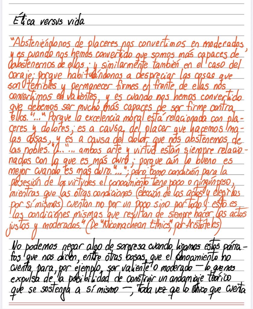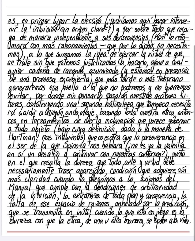 No podemos negar algo de sorpresa cuando ligamos estos párrafos que nos dicen, entre otras cosas, que el conocimiento no cuenta para, por ejemplo, ser valiente o moderado – lo que nos expulsa de la posibilidad de construir un andamiaje teórico que se sostenga a sí mismo –, toda vez que lo único que cuenta es, en primer lugar, la elección (¿podríamos aquí hacer intervenir la intuición sin origen claro?) y por sobre todo que recaiga de manera independiente a sus consecuencias (Kant lo retomará con más razonamientos – que por lo dicho, no necesitamos), a lo que sumamos la idea de ejercer la virtud de que se trate sin que estemos justificados al hacerlo, ajeno a cualquier cadena de razones, asumiendo (y estamos en presencia de una promesa encubierta) que más tarde o más temprano generaremos esa huella a la que no podremos y no queremos evitar, por donde sin pensarlo pasarán nuestras acciones futuras, construyendo una segunda naturaleza que tampoco necesitará acudir a ningún andamiaje, basando toda nuestra ética, entonces, en forzamientos de cierta inclinación que parece gobernar a todo objeto (bajo cuya definición, dada, a la manera de Hartman, nos incluimos) que no es otra que la perseverancia en el ser de la que Spinoza nos hablara (¿no es ya la valentía en sí un desafío a continuar con nuestros contornos?), punto en el que resalta la dureza que todo, arte y virtud, debe necesariamente traer aparejada, condición que adquiere aún más claridad cuando la plegamos a los axiomas del Manual que cumple con las condiciones de arbitrariedad de la intuición, la extrañeza de todo plan y consecuencia, la falta de ese espacio de razones anhelado por la predicción, que se transmuta en inútil cuando lo que está en juego es la dureza con que la ética, de una u otra manera, se opone a la vida.