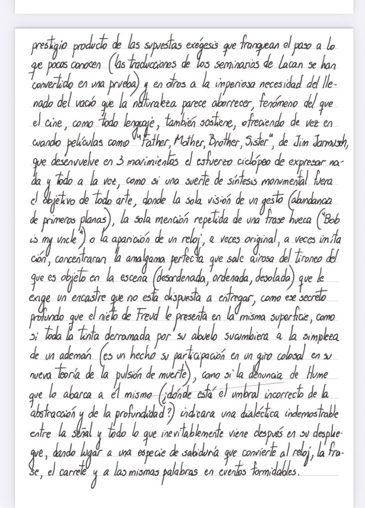 No podría negarse cierta tendencia a interpretaciones rebuscadas (quizás por eso la atención haya sido puesta en la navaja de Ockham – aunque probablemente se deba más a la exigencia de eficiencia económica en las explicaciones científicas, a las que solo se les pide repetición y extensión de resultados), ligadas en algún caso a la posibilidad de cierto prestigio producto de las supuestas exégesis que franquean el paso a lo que pocos conocen (Las traducciones de los seminarios de Lacan se han convertido en una prueba) y en otros a la imperiosa necesidad del llenado del vacío que la naturaleza parece aborrecer, fenómeno del que el cine, como todo lenguaje, también sostiene, ofreciendo de vez en cuando películas como “Father, Mother, Brother, Sister”, de Jim Jarmusch, que desenvuelve en 3 movimientos el esfuerzo ciclópeo de expresar nada y todo a la vez, como si una suerte de síntesis monumental fuera el objetivo de todo arte, donde la sola visión de un gesto (abundancia de primeros planos), la sola mención repetida de una frase hueca («Bob is my uncle») o la aparición de un reloj, a veces original, a veces imitación, concentraran la amalgama perfecta que sale airosa del tronco del que es objeto en la escena (desordenada, ordenada, desolada) que le exige un encastre que no está dispuesta a entregar, como ese secreto profundo que el nieto de Freud le presenta en la misma superficie, como si toda la tinta derramada por su abuelo sucumbiera a la simpleza de un ademán (es un hecho su participación en un giro colosal en su nueva teoría de la pulsión de muerte), como si la denuncia de Hume que lo abarca a él mismo (¿dónde está el umbral incorrecto de la abstracción y de la profundidad?) indicara una dialéctica indemostrable entre la señal y todo lo que inevitablemente viene después en su despliegue, dando lugar a una especie de sabiduría que convierte al reloj, la frase, el carrete y a las mismas palabras en eventos formidables.