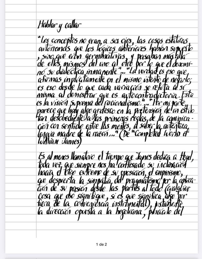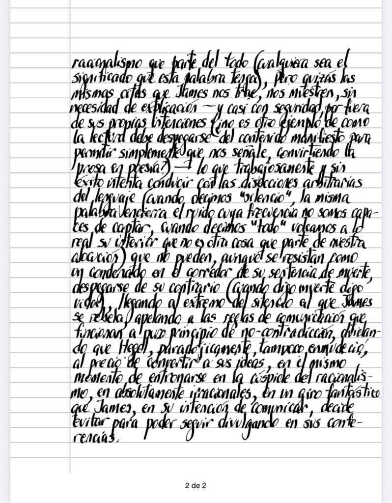 Es al menos llamativo el tiempo que James dedica a Hegel, toda vez que siempre nos ha confesado su inclinación hacia el otro extremo de su oposición, el empirismo, que despierta la simpatía del pragmatismo por la aplicación de su pasión desde las partes al todo (cualquier cosa que eso signifique, si es que significa algo por fuera de la conveniencia instrumental), justamente la dirección opuesta a la hegeliana, pináculo del racionalismo que parte del todo (cualquiera sea el significado que esta palabra tenga), pero quizá las mismas citas que James nos trae, nos muestren, sin necesidad de explicación – y casi con seguridad, por fuera de sus propias intenciones fino es otro ejemplo de como la lectura debe despegarse del contenido manifiesto para permitir simplemente que nos señale, convirtiendo la prosa en poesía?) – lo que trabajosamente y sin éxito intenta conducir con las disecciones arbitrarias del lenguaje (cuando decimos «silencio», la misma palabra encierra el ruido cuya frecuencia no somos capaces de captar, cuando decimos «todo» volcamos a lo real su interior que no es otra cosa que parte de nuestra alocución) que no pueden, aunque se resistan como un condenado en el corredor de su sentencia de muerte, despegarse de su contrario (cuando digo muerte digo vida), llegando al extremo del silencio al que James se rebela, apelando a las reglas de comunicación que funcionan a puro principio de no-contradicción, olvidando que Hegel paradójicamente, tampoco enmudeció, al precio de convertir a sus ideas, en el mismo momento de entronarse en la cúspide del racionalismo, en absolutamente irracionales, en un giro fantástico que James, en su intención de comunicar, decide evitar para poder seguir divulgando en sus conferencias.