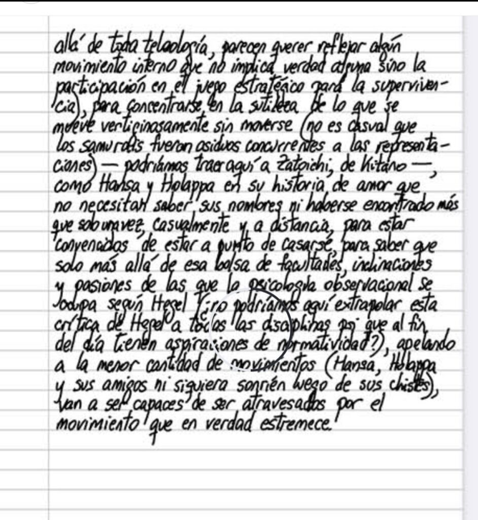 El teatro Nō, probablemente como cualquier otra cosa, atravesado como está de mitos de nacimiento y avatares históricos, impide el ejercicio genealógico, o más precisamente, lo circunscribe a narraciones metafóricas, ajenas a la dudosa objetividad (¿no nos mostró Foucault magistralmente lo que nos está permitido decir a partir de la enciclopedia china de Borges?), que nos abren la puerta para juzgar el significado de esas máscaras que impiden distraerse en los movimientos de los músculos de la cara (es sabido que disponemos de la mayor cantidad entre los animales, lo que más allá de toda teleología, parecen querer reflejar algún movimiento interno que no implica verdad alguna sino la participación en el juego estratégico para la supervivencia), para concentrarse en la sutileza de lo que se mueve vertiginosamente sin moverse (no es casual que los samuráis fueran asiduos concurrentes a las representaciones —podríamos traer aquí a Zatoichi, de Kitano—, como Hansa y Holappa en su historia de amor que no necesitan saber sus nombres ni haberse encontrado más que solo una vez, casualmente y a distancia, para estar convencidos de estar a punto de casarse, para saber que solo más allá de esa bolsa de facultades, inclinaciones y pasiones de las que la psicología observacional se ocupa según Hegel (¿no podríamos aquí extrapolar esta crítica de Hegel a todas las disciplinas ya que al fin del día tienen aspiraciones de normatividad?), apelando a la menor cantidad de movimientos (Hansa, Holappa y sus amigos ni siquiera sonríen luego de sus chistes), van a ser capaces de ser atravesados por el movimiento que en verdad estremece.