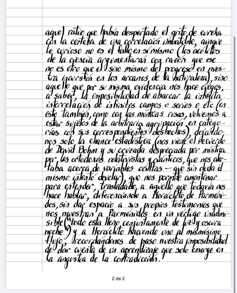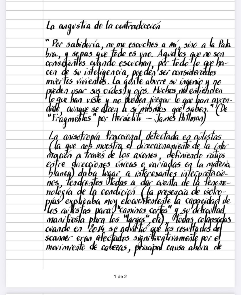 La anisotropía fraccional detectada en autistas ( la que nos muestra el direccionamiento de la información a través de los axones, definiendo ratios entre direcciones únicas o variadas en la materia blanca) daba lugar a interesantes interpretaciones, tendientes todas a dar cuenta de la fenomenología de la condición( la presencia de isotropías explicaba muy elocuentemente la capacidad de los artistas para» caminos cortos» y su dificultad manifiesta para los» largos», etc), todas colapsadas cuando en 2014 se advirtió que los resultados del scanner eran afectados significativamente por el movimiento de cabezas, principal causa ahora de aquel ratio que había despertado el grito de eureka con la certeza de una correlación imbatible, aunque lo curioso no es el fallo en sí mismo (los acólitos de la ciencia argumentaran con razón que ese no es otro que el sino mismo del progreso en nuestra incursión en los arcanos de la naturaleza), sino aquello que por su misma evidencia nos hace ciegos, a saber, la imposibilidad de abarcar la infinita interrelación de infinitos campos o series o etc (en esto también, como con las muñecas rusas, volvemos a estar sujetos de la arbitraria agrupación en categorías con sus correspondientes deshechos), dejándonos solo la chance estadística (nos viene el recuerdo de David Bohm y su cruzada despreciada por mística por los ortodoxos relativistas y cuánticos, que nos alertaba acerca de variables ocultas-que sin duda él mismo intentó develar), que nos permite amontonar para entender, trasladado a aquello que todavía nos hace hablar, diferenciando a Heráclito de Parménides, sin dar espacio a sus propios testimonios que nos muestran a Parménides en un vértigo inadmisible (“todo esta lleno con’untamente de luz y oscura noche”) y a Heráclito Haciendo uno al mismísimo flujo, recordándonos de paso nuestra imposibilidad de dar cuenta de un aprendizaje que solo emerge en la angustia de la contradicción.