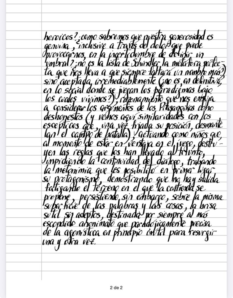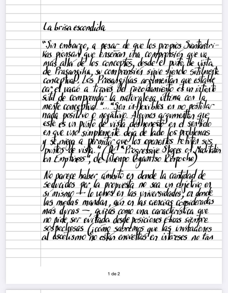 No parece haber ámbito en donde la cantidad de seducidos por la propuesta no sea un objetivo en sí mismo – lo vemos en las universidades, en donde las modas mandan, aún en las ciencias consideradas más duras -, quizás como una característica que no pide ser evitada desde posiciones éticas siempre sospechosas (¿cómo sabremos que las invitaciones al ascetismo no están envueltas en intereses no tan heroicos? ¿como sabremos que nuestra generosidad es genuina, inclusive a través del dolor que puede provocarnos, en la incertidumbre de definir un umbral?¿no es la lista de Schindler la metáfora perfecta que nos lleva a que siempre faltará un nombre más?), sino aceptada irremediablemente (¿no es, en definitiva, en lo social donde se juegan los paradigmas bajo los cuales vivimos?), razonamiento que nos empuja a considerar los argumentos de los Prasangikas como deshonestos (y vemos aquí similaridades con los escépticos que, una vez fijada su posición, desmantelan el campo de batalla), actuando como niños que, al momento de estar en ventaja en el juego, destruyen las reglas que los han llevado al triunfo, impidiendo la continuidad del diálogo, trabando la metonimia que les posibilita en primer lugar su protagonismo, demostrando. que no hay salida fatigando el terreno en el que la contienda se propone, persistiendo sin embargo, sobre la misma superficie de las palabras y las cosas, la brisa sutil sin adeptos, destinada por siempre al más escondido anonimato que paradójicamente precisa de la agonística en principio inútil para resurgir una y otra vez.