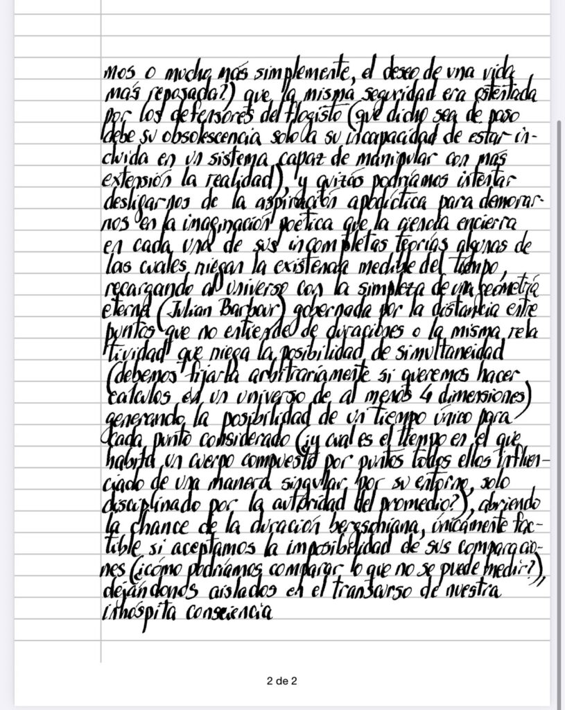 Estamos a un tris de caer una vez más en la trampa de acudir a la ciencia – sobre todo a desarrollos contemporáneos que tienen para nosotros el brillo de lo irrefutable (¿quien puede discutir los experimentos actuales del acelerador de partículas? – ni siquiera, podríamos decir, ningún funcionario de esa maquinaria, impedido, como lo estamos todos, de manejar todas las variables que lo gobiernan a un tiempo), olvidando (¿ será un olvido producto de represiones que no dominamos o mucho mas simplemente, el deseo de una vida más reposada?) que la misma seguridad era ostentada por los defensores del flogisto (que dicho sea de paso debe su obsolescencia solo a su incapacidad de estar incluida en un sistema capaz de manipular con mas extensión la realidad), y quizá podríamos intentar desligarnos de la aspiración apodíctica para demorarnos en la imaginación poética que la ciencia encierra en cada una de sus incompletas teorías algunas de las cuales niegan la existencia medible del tiempo, recargando al universo con la simpleza de una geometría eterna (Julian Barbour) gobernada por la distancia entre puntos que no entiende de duraciones o la misma relatividad que niega la posibilidad de simultaneidad (debemos fijarla arbitrariamente si queremos hacer cálculos en un universo de al menos 4 dimensiones) generando la posibilidad de un tiempo unico para cada punto considerado (¿y cual es el tiempo en el que habita un cuerpo compuesto por puntos todos ellos influenciado de una manera singular por su entorno, solo disciplinado por la autoridad del promedio?), abriendo la chance de la duración bergsoniana, únicamente factible si aceptamos la imposibilidad de sus comparaciones (¿cómo podríamos comparar lo que no se puede medir?), dejándonos aislados en el transcurso de nuestra inhóspita consciencia.