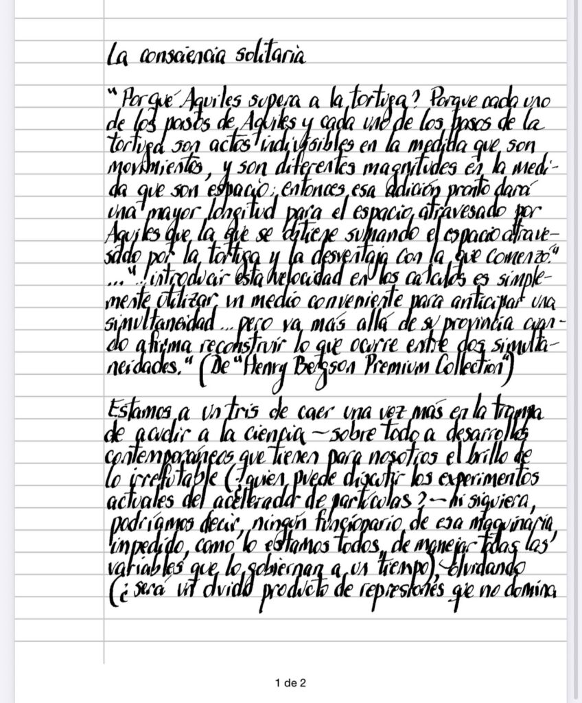 » Por qué Aquiles supera a la tortuga? Porque cada uno de los pasos de Aquiles y cada uno de los pasos de la tortuga son actos indivisibles en la medida que son movimientos, y son diferentes magnitudes en la medida que son espacio: entonces esa adición pronto dará una mayor longitud para el espacio atravesado por Aquiles que la que se obtiene sumando el espacio atravesado por la tortuga y la desventaja con la que comenzó.» …»… introducir esta velocidad en los cálculos es simplemente utilizar un medio conveniente para anticipar una simultaneidad… pero va más allá de su provincia cuando afirma reconstruir lo que ocurre entre dos simultaneidades.» (De «Henry Bergson Premium Collection»)