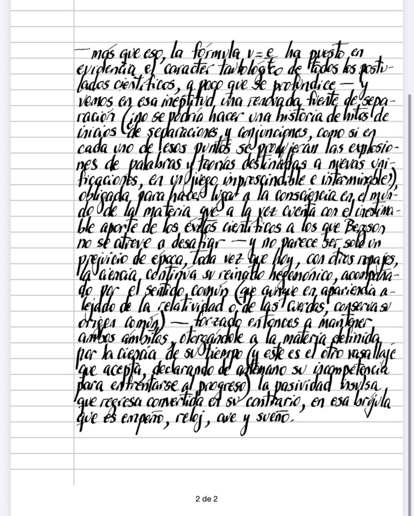Desde Zenón, la medición del tiempo se ha mostrado impotente para explicar el movimiento de la flecha – más que eso, la fórmula v=e/y, ha puesto en evidencia el caracter tautológico de todos los postu­lados científicos, a poco que se profundice – y vemos en esa ineptitud una renovada fuente de sepa­ración (¿no se podría hacer una historia de hitos de inicios de separaciones y conjunciones, como si en cada uno de esos puntos se produjeran las explosio­nes de palabras y teorías destinadas a nuevas uni­ficaciones, en un juego imprescindible e interminable?), obligada para hacer lugar a la consciencia en el mun­do de la materia que a la vez cuenta con el inestima­ble aporte de los éxitos científicos a los que Bergson no se atreve a desafiar – y no parece ser solo un prejuicio de época, toda vez que hoy, con otros ropajes, la ciencia continúa su reinado hegemónico, acompaña­do por el sentido común (que aunque en apariencia a­lejado de la relatividad o de las cuerdas, conserva su origen común) – forzado entonces a mantener ambos ámbitos, otorgándole a la materia definida por la ciencia de su tiempo (y este es el otro vasallaje que acepta, declarando de antemano su incompetencia para enfrentarse al progreso) la pasividad insulsa que regresa convertida en su contrario, en esa brújula que es empeño, reloj, ave y sueño.