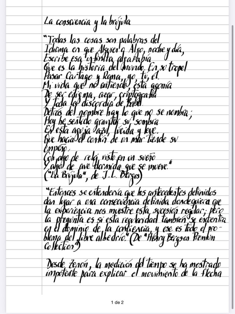 » Entonces se entendería que los antecedentes definidos dan lugar a una consecuencia definida dondequiera que la experiencia nos muestre esta sucesión regular; pero la pregunta es si esta regularidad también se encuentra en el dominio de la conciencia, y ese es todo el pro­blema del libre albedrío” (De «Henry Bergson Premium Collection”)