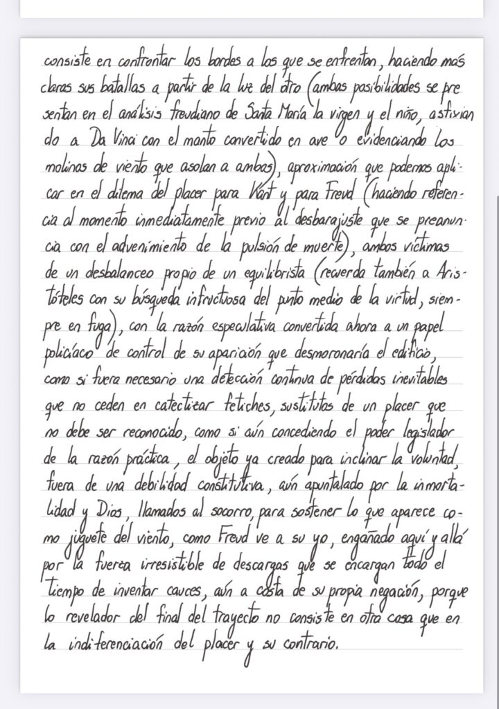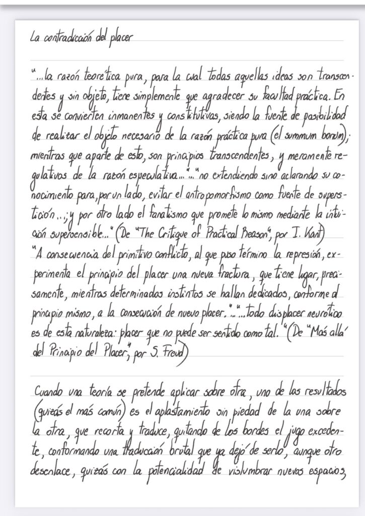 Cuando una teoría se pretende aplicar sobre otra, uno de los resultados (quizás el más común) es el aplastamiento sin piedad de la una sobre la otra, que recorta y traduce, quitando de los bordes el jugo excedente conformando una traducción brutal que ya dejó de serlo, aunque otro desenlace, quizás con la potencialidad de vislumbrar nuevos espacios, consiste en confrontar los bordes a los que se enfrentan, haciendo más claras sus batallas a partir de la luz del otro (ambas posibilidades se presentan en el análisis freudiano de Santa María la virgen y el niño, asfixiando a Da Vinci con el manto convertido en ave o evidenciando los molinos de viento que asolan a ambos) aproximación que podemos aplicar en el dilema del placer para Kant y para Freud (haciendo referencia al momento inmediatamente previo al desbarajuste que se preanuncia con el advenimiento de la pulsión de muerte), ambos víctimas de un desbalanceo propio de un equilibrista (recuerda también a Aristóteles con su búsqueda infructuosa del punto medio de la virtud, siempre en fuga), con la razón especulativa convertida ahora a un papel policíaco de control de su aparición que desmoronaría el edificio como si fuera necesario una detección continua de pérdidas inevitables que no ceden en catectizar fetiches, sustitutos de un placer que no debe ser reconocido, como si aún concediendo el poder legislador de la razón práctica, el objeto ya creado para inclinar la voluntad fuera de una debilidad constitutiva, aún apuntalado por la inmortalidad y Dios, llamados al socorro, para sostener lo que aparece como juguete del viento, como Freud ve a su yo, engañado aquí y allá por la fuerza irresistible de descargas que se encargan todo el tiempo de inventar cauces, aún a costa de su propia negación, porque lo revelador del final del trayecto no consiste en otra cosa que en la indiferenciación del placer y su contrario.