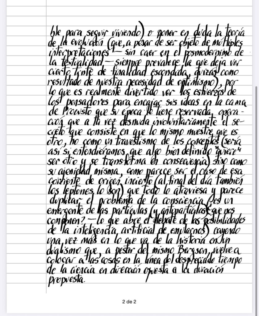Parados como estamos en el medio de la hybris de nuestro sitiado yo, no nos posible reconocer el limitado encuadre que nos es dado para pensar (¿hay manera de desprenderse del lenguaje, del propio tiempo, de las certezas entregadas por el sentido común de la época que habitamos?) y está claro que remitiría a una gran audacia descreer del progreso a principios del siglo XX (aunque, hay que decirlo, todo tiempo a su manera hace difícil desligarse de la prosperidad recibida y la por la porvenir – probablemente una idea imprescindible para seguir viviendo) o poner en duda la teoría de la evolución (que, a pesar de ser objeto de múltiples interpretaciones – sin caer en el posmodernismo de la textualidad – siempre prevalece la que deja ver cierto tinte de finalidad escondida, quizás como resultado de nuestra necesidad de optimismo), por lo que es realmente divertido ver los esfuerzos de los pensadores para encajar sus ideas en la cama de Procusto que su época le tiene reservada operación que a la vez desnuda involuntariamente el secreto que consiste en que lo mismo muestre que es otro, no como un travestismo de los conceptos (sería así si entendiéramos que algo bien definido «quiere» ser otro y se transforma en consecuencia) sino como su ajenidad misma, como parece ser el caso de esa corriente de origen incierto (al final del día también los leptones lo son) que todo lo atraviesa y parece duplicar el problema de la consciencia (¿es un emergente de las partículas (y antipartículas) que nos componen? – lo que abre el debate de las posibilidades de la inteligencia artificial de emularnos cayendo una vez mas en lo que va de la historia en un dualismo que, a pesar del mismo Bergson, vuelve a colocar a las cosas en la línea del despreciado tiempo de la ciencia en dirección opuesta a la duración propuesta.