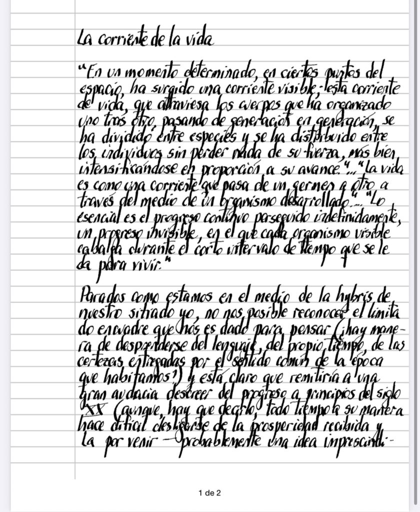 «En un momento determinado, en ciertos puntos del espacio, ha surgido una corriente visible; esta corriente de vida, que atraviesa los cuerpos que ha organizado uno tras otro, pasando de generación en generación, se ha dividido entre especies y se ha distribuido entre los individuos sin perder nada de su fuerza, más bien intensificándose en proporción a su avance.»…»la vida es como una corriente que pasa de un germen a otro a través del medio de un organismo desarrollado»….»Lo esencial es el progreso continuo perseguido indefinidamente, un progreso invisible, en el que cada organismo visible cabalga durante el corto intervalo de tiempo quesele da para vivir.» (De “Henry Bergson Premium Collection”)