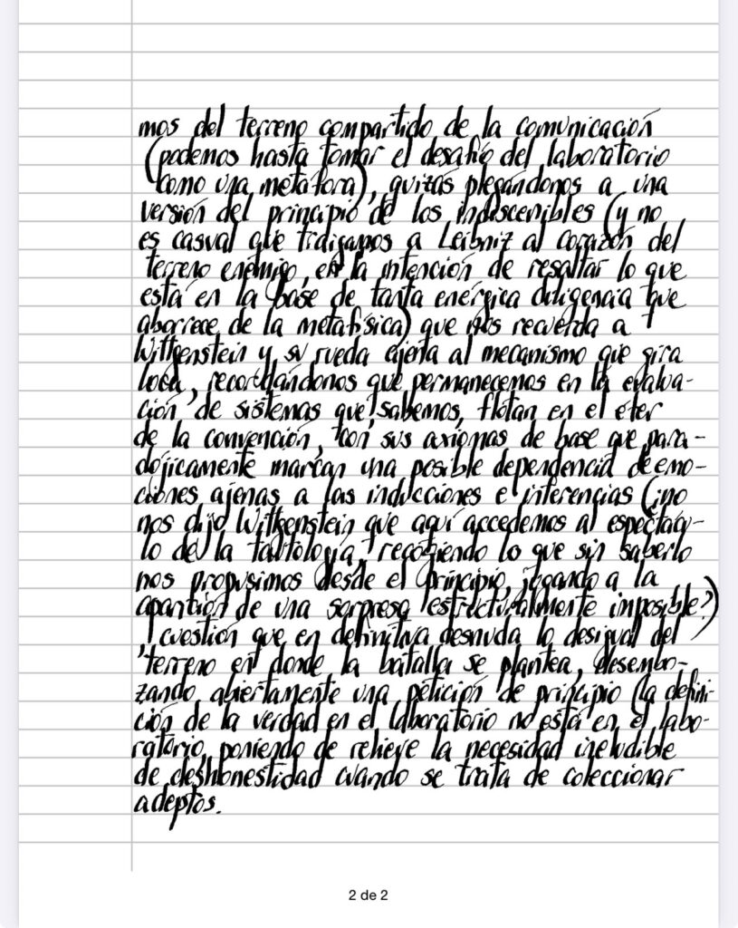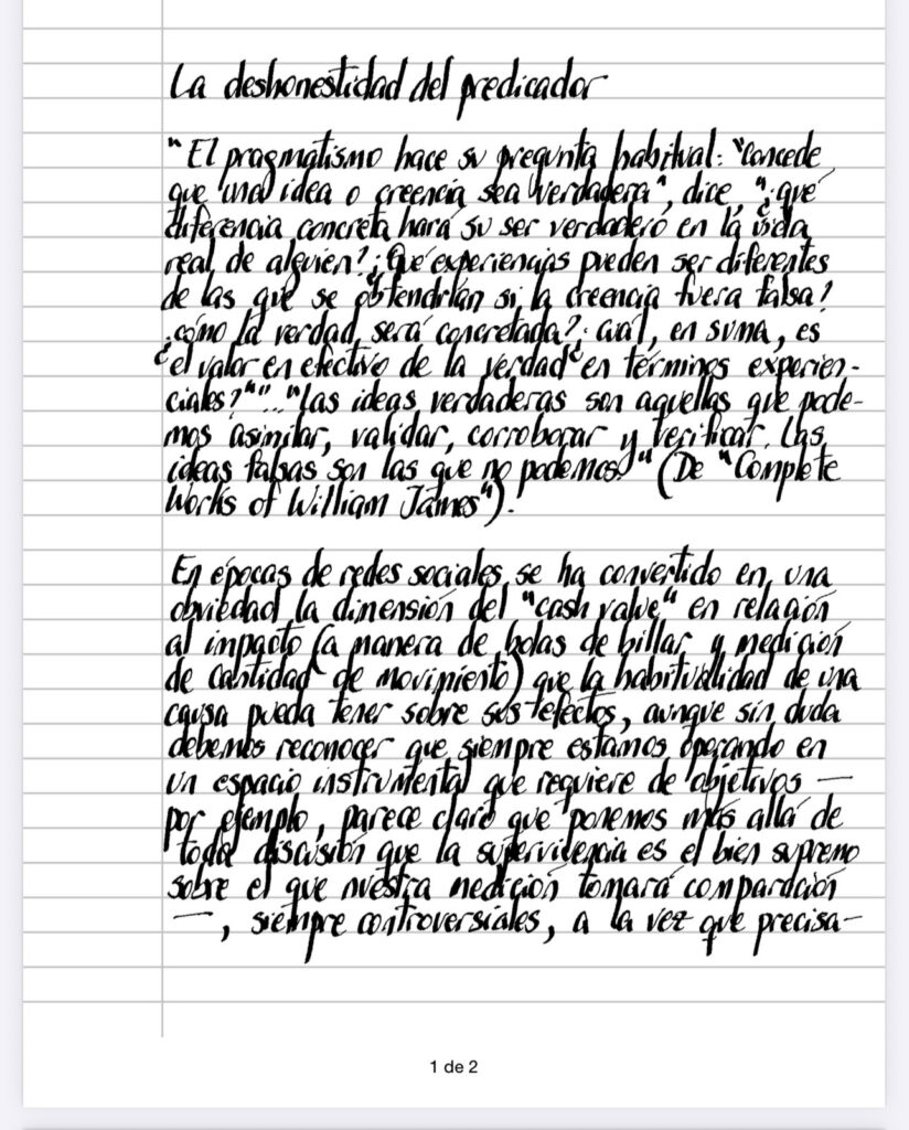 En épocas de redes sociales se ha convertido en una obviedad la dimensión del «cash value» en relación al impacto (a manera de bolas de billar y medición de cantidad de movimiento) que la habitualidad de una causa pueda tener sobre sus efectos, aunque sin duda debemos reconocer que siempre estamos operando en un espacio instrumental que requiere de objetivos – por ejemplo, parece claro que ponemos más allá de toda discusión que la supervivencia es el bien supremo sobre el que nuestra medición tomará comparación -, siempre controversiales, a la vez que precisamos del terreno compartido de la comunicación (podemos hasta tomar el desafío del laboratorio como una metáfora), quizás plegándonos a una versión del principio de los indiscernibles (y no es casual que traigamos a Leibniz al corazón del terreno enemigo, en la intención de resaltar lo que está en la base de tanta enérgica diligencia que aborrece de la metafísica) que nos recuerda a Wittgenstein y su rueda ajena al mecanismo que gira loca, recordándonos que permanecemos en la evaluación de sistemas que, sabemos, flotan en el éter de la convención, con sus axiomas de base que paradójicamente marcan una posible dependencia de emociones ajenas a las inducciones e inferencias (¿no nos dijo Wittgenstein que aquí accedemos al espectáculo de la tautología, recogiendo la que sin saberlo nos propusimos desde el principio, jugando a la aparición de una sorpresa estructuralmente imposible?), cuestión que en definitiva desnuda lo desigual del terreno en donde la batalla se plantea, desembaozando abiertamente una petición de principio (la definición de la verdad en el laboratorio no está en el laboratorio), poniendo de relieve la necesidad ineludible de deshonestidad cuando se trata de coleccionar adeptos.