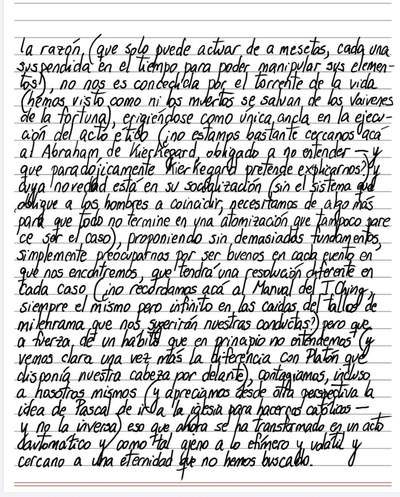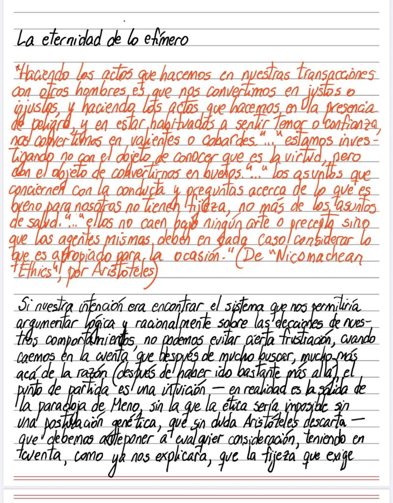 Si nuestra intención era encontrar el sistema que nos permitiría argumentar lógica y racionalmente sobre las elecciones de nuestros comportamientos, no podemos evitar cierta frustración, cuando caemos en la cuenta que después de mucho buscar, mucho más acá de la razón (después de haber ido bastante más allá) el punto de partida es una intuición – en realidad es la salida de la paradoja de Menón, sin la que la ética sería imposible sin una postulación genética, que sin duda Aristóteles descarta – que debemos detener a cualquier consideración, teniendo en cuenta como ya nos explicara, que la fijeza que exige la razón (que solo puede actuar de a mesetas, cada una suspendida en el tiempo para poder manipular sus elementos), no nos es concedida por el torrente de la vida (hemos visto como ni los muertos se salvan de los vaivenes de la fortuna), erigiéndose como única ancla en la ejecución del acto ético (¿no estamos bastante cercanos acá al Abraham de Kierkegaard, obligado a no entender – y que paradójicamente Kierkegaard pretende explicarnos?) y cuya novedad está en su socialización (sin el sistema que obligue a los hombres a coincidir, necesitamos de algo más para que todo no termine en una atomización que tampoco parece ser el caso), proponiendo sin demasiados fundamentos, simplemente preocuparnos por ser buenos en cada evento en que nos encontremos, que tendrá una resolución diferente en cada caso (¿no recordamos acá al Manual del I Ching, siempre el mismo pero infinito en las caídas del tallo de milenrama que nos sugerirán nuestras conductas?) pero que a fuerza, de un hábito que en principio no entendemos (y vemos clara una vez más la diferencia con Platón que disponía nuestra cabeza por delante), contagiamos, incluso a nosotros mismos (y apreciamos desde otra perspectiva la idea de Pascal de ir a la iglesia para hacernos católicos – y no la inversa) eso que ahora se ha transformado en un acto automático y como tal ajeno a lo efímero y volátil y cercano a una eternidad que no hemos buscado.