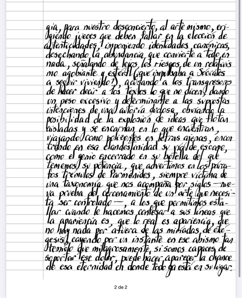 La ciencia y el sentido común aborrecen las interpretaciones en abismo, en la obligación permanente de dar respuestas imprescindibles para la construcción sucesiva – casi como lo que observamos cuando se magnifica un proceso biológico con los suficientes aumentos como para advertir un cierto caos palpitante que va tomando formas asombrosas desde el sin sentido -, sentimiento que contagia, para nuestro desconcierto, al arte mismo, erigiendo jueces que deben fallar en la elección de autenticidades, imponiendo identidades canónicas, desechando la abundancia que convierte a todo en nada, señalando de lejos los riesgos de un relativismo agobiante y estéril (qué impulsaba a Sócrates a seguir viviendo?), acusando a los transgresores de hacer decir a los textos lo que no dicen, dando un peso excesivo y determinante a las supuestas intenciones de una autoría dudosa, obviando la posibilidad de la explosión de ideas que flotan aisladas y se encarnan en lo que encuentran, viajando como polizontes en letras ajenas, encontrando en esa clandestinidad su vía de escape, como el genio encerrado en su botella del que tememos su potencia, que advertimos en los párrafos trémulos de Parmenides, siempre víctima de una taxonomía que nos acompaña por siglos – nueva prueba del cercenamiento de un arte que necesita ser controlado -, a los que permitimos estallar cuando le hacemos confesar a sus líneas que la apariencia es, que lo real es apariencia, que no hay nada por afuera de las miríadas de exégesis, cayendo por un instante en ese abismo tan temido que milagrosamente, si somos capaces de soportar ese dolor, puede hacer aparecer la chance de esa eternidad en donde todo ya está en su lugar.