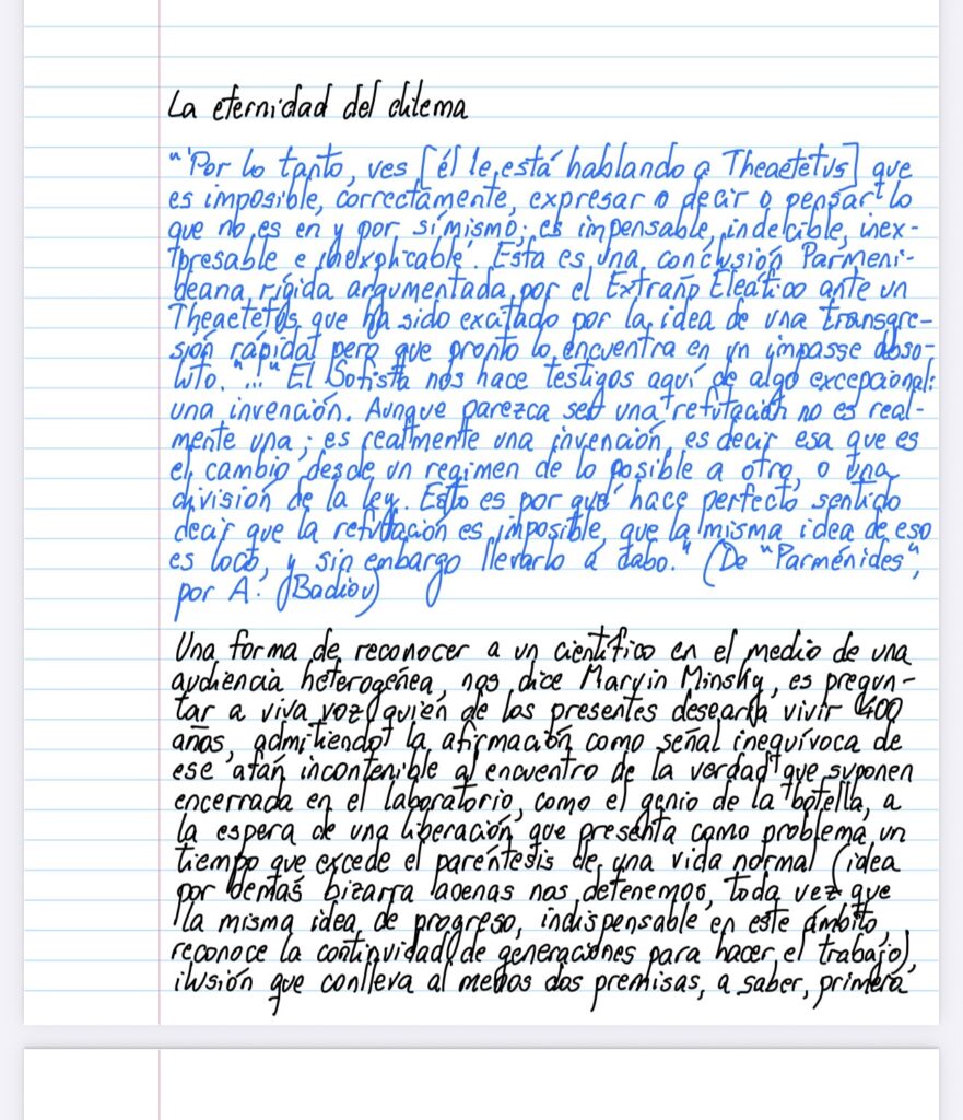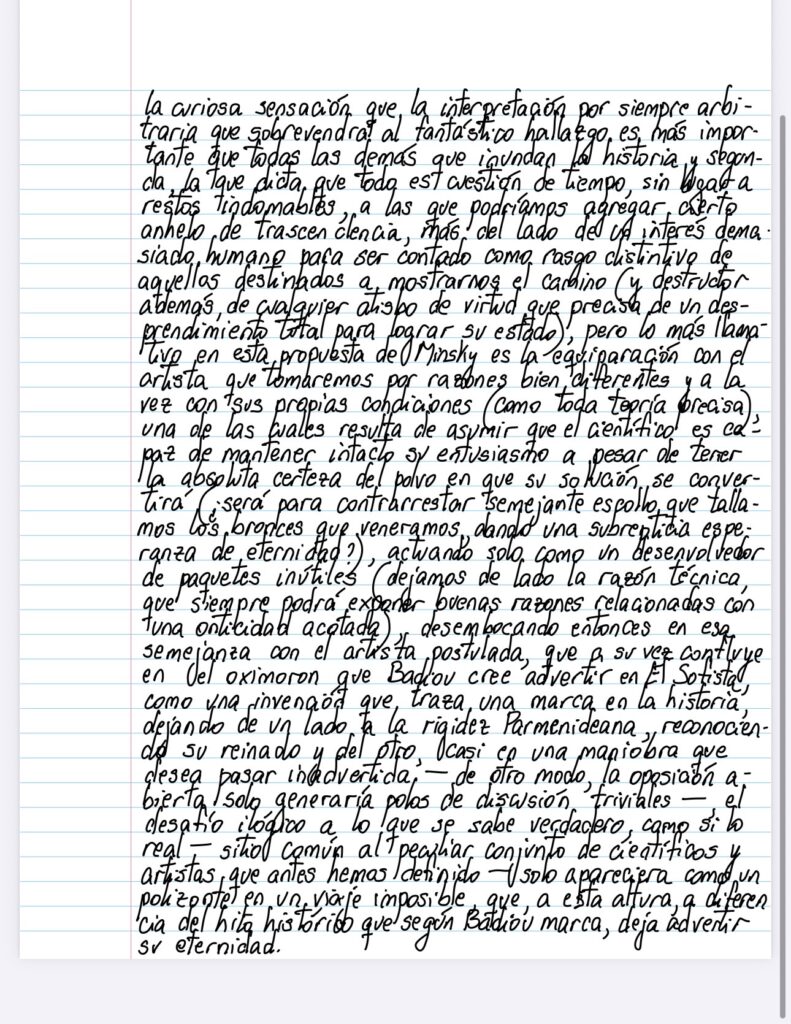 Una forma de reconocer a un científico en el medio de una audiencia heterogénea, nos dice Marvin Minsky, es preguntar a viva voz quien de los presentes desearía vivir 400 años, admitiendo la afirmación como señal inequívoca de ese afán incontenible al encuentro de la verdad que suponen encerrada en el laboratorio, como el genio de la botella, a la espera de una liberación que presenta como problema un tiempo que excede el paréntesis de una vida normal (idea por demás bizarra arenas nos detenemos, toda vez que la misma idea de progreso, indispensable en este ámbito, reconoce la continuidad de generaciones para hacer el trabajo), ilusión que conlleva al menos dos premisas, a saber, primerala curiosa sensación que la interpretación por siempre arbitraria que sobrevendrá al fantástico hallazgo es más importante que todas las demás que inundan la historia y segunda, la que dicta que todo es cuestión de tiempo, sin lugar a restos indomables, a las que podríamos agregar cierto anhelo de trascendencia, más del lado de un interés demasiado humano para ser contado como rasgo distintivo de aquellos destinados a mostrarnos el camino (y destructor además, de cualquier atisbo de virtud que precisa de un desprendimiento total para lograr su estado), pero lo más llamativo en esta propuesta de Minsky es la equiparación con el artista que tomaremos por razones bien diferentes y a la vez con sus propias condiciones (como toda teoría precisa), una de las cuales resulta de asumir que el científico es capaz de mantener intacto su entusiasmo a pesar de tener la absoluta certeza del polvo en que su solución se convertirá (¿será para contrarrestar seme ‘ante escollo que tallamos los bronces que veneramos, dando una subrepticia esperanza de eternidad?), actuando solo como un desenvolvedor de paquetes inútiles (dejamos de lado la razón técnica, que siempre podrá exponer buenas razones relacionadas con una onticidad acotada), desembocando entonces en esa semejanza con el artista postulada, que a su vez confluye en el oxímoron que Badiou cree advertir en El Sofista, como una invención que traza una marca en la historia, dejando de un lado a la rigidez Parmenideana, reconociendo su reinado y del otro, casi en una maniobra que desea pasar inadvertida – de otro modo, la oposición abierta solo generaría polos de discusión triviales -, el desafío ilógico a lo que se sabe verdadero, como si lo real – sitio común al peculiar conjunto de científicos y artistas que antes hemos definido – solo apareciera como un polizonte en un viaje imposible, que, a esta altura, a diferencia del hito histórico que según Badiou marca, deja advertir su eternidad.