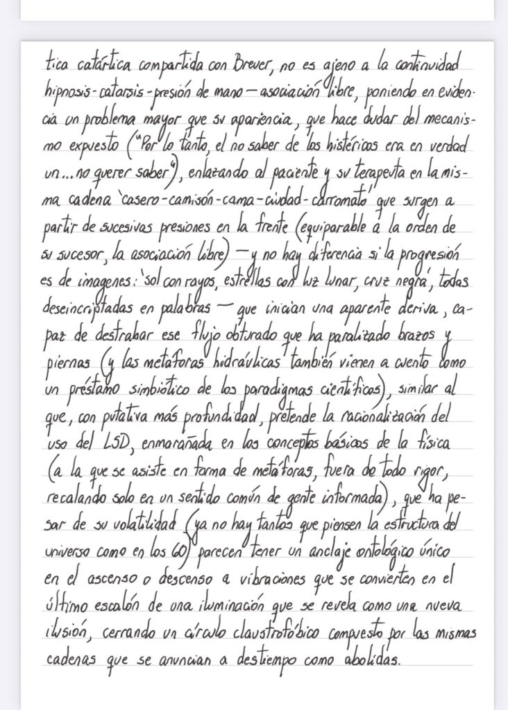 En un párrafo perdido, Freud confiesa la necesidad de un cierto nivel de inteligencia del lado del paciente (las confidencias de Freud exceden los niveles habituales de los científicos —sobresaliendo sus fracasos en las esperadas curas), comentario que, a pesar de estar hilado a la práctica catártica compartida con Breuer, no es ajeno a la continuidad hipnosis-catarsis-presión de mano-asociación libre, poniendo en evidencia un problema mayor que su apariencia, que hace dudar del mecanismo expuesto («Por lo tanto, el no saber de los histéricos era en verdad un … no querer saber»), enlazando al paciente y su terapeuta en la misma cadena casero – camisón – cama – ciudad – carromato, que surgen a partir de sucesivas presiones en la frente (equiparable a la orden de su sucesor, la asociación libre) — y no hay diferencia si la progresión es de imágenes: ‘sol con rayos, estrellas con luz lunar, cruz negra’, todas desencriptadas en palabras — que inician una aparente deriva, capaz de destrabar ese flujo obturado que ha paralizado brazos y piernas (y las metáforas hidráulicas también vienen a cuento como un préstamo simbiótico de los paradigmas científicos), similar al que, con putativa más profundidad, pretende la racionalización del uso del LSD, enmarañada en los conceptos básicos de la física (a la que se asiste en forma de metáforas, fuera de todo rigor, recalando solo en un sentido común de gente informada), que a pesar de su volatilidad (ya no hay tantos que piensen la estructura del universo como en los 60) parecen tener un anclaje ontológico único en el ascenso o descenso a vibraciones que se convierten en el último escalón de una iluminación que se revela como una nueva ilusión, cerrando un círculo claustrofóbico compuesto por las mismas cadenas que se anuncian a destiempo como abolidas.