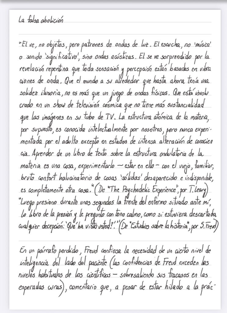 «El ve, no objetos, pero patrones de ondas de luz. El escucha, no ‘música o sonido significativo’, sino ondas acústicas. El se ve sorprendido por la revelación repentina que toda sensación y percepción están basados en vibraciones de onda. Que el mundo a su alrededor que hasta ahora tenía una solidez ilusoria, no es más que un juego de ondas físicas. Que está involucrado en un show de televisión cósmica que no tiene más sustancialidad que las imágenes en su tubo de TV. La estructura atómica de la materia, por supuesto, es conocida intelectualmente por nosotros, pero nunca experimentada por el adulto excepto en estados de intensa alteración de consciencia. Aprender de un libro de texto sobre la estructura ondulatoria de la materia es una cosa, experimentarlo —estar en ello— con el viejo, familiar, bruto confort alucinatorio de casas ‘sólidas’ desaparecido e indisponible, es completamente otra cosa.» (De The Psychedelic Experience por T. Leary). «Luego presiono durante unos segundos la frente del enfermo situado ante mí, lo libro de la presión y le pregunto con tono calmo, como si estuviera descartada cualquier decepción: ¿Qué ha visto usted?» (De “Estudios sobre la histeria”, por S. Freud)
