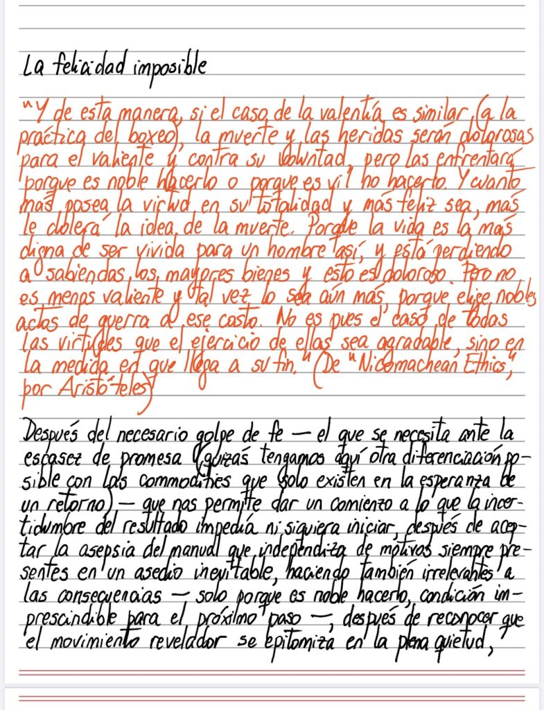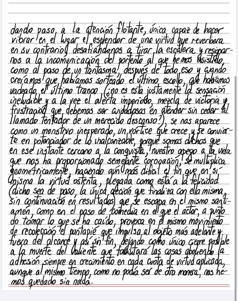 Después del necesario golpe de fe — el que se necesita ante la escasez de promesa (quizás tengamos aquí otra diferenciación posible con las commodities que solo existen en la esperanza de un retorno) — que nos permite dar un comienzo a lo que la incertidumbre del resultado impedía ni siquiera iniciar después de aceptar la asepsia del manual que independiza de motivos siempre presentes en un asedio inevitable, haciendo también irrelevantes a las consecuencias — solo porque es noble hacerlo, condición imprescindible para el próximo paso —, después de reconocer que el movimiento revelador se epitomiza en la plena quietud, dando paso, a la atención flotante, única, capaz de hacer vibrar en el lugar el esplendor de una virtud que reverbera en su contrario desafiándonos a tirar la escalera y resignarnos a la incomunicación del portento al que hemos asistido como al paso de un fantasma, después de todo eso y cuando creíamos que habíamos sorteado el último escollo, que habíamos vadeado el último tranco (no es esta justamente la sensación ineludible y a la vez el alerta imperioso, mezcla de victoria y frustración que debemos ser cuidadosos en atender sin ceder el llamado tentador de un merecido descanso?), se nos aparece como un monstruo inesperado, un vórtice que crece y se convierte en potenciador de lo inalcanzable, porque somos dichos que en ese instante cercano a la conquista, nuestro apego a la vida que nos ha proporcionado semejante coronación, se multiplica geométricamente, haciendo aún más difícil el fin que en sí misma la virtud ostenta, plegada como está a la felicidad (dicho sea de paso, la única acción que finaliza con ella misma sin continuación en resultados) que se escapa en el mismo santiamén, como en el paso de comedia en el que el actor, a punto de tomar lo que se ha caído, provoca en el mismo movimiento de recolección el puntapié que impulsa al objeto más adelante y fuera del alcance y así sin fin, dejando como único cierre posible a la muerte del valiente que facilitará las cosas aboliendo la adhesión siempre en crecimiento en cada cuota de virtud aplicada aunque al mismo tiempo, como no podía ser de otra manera, nos hemos quedado sin nada.