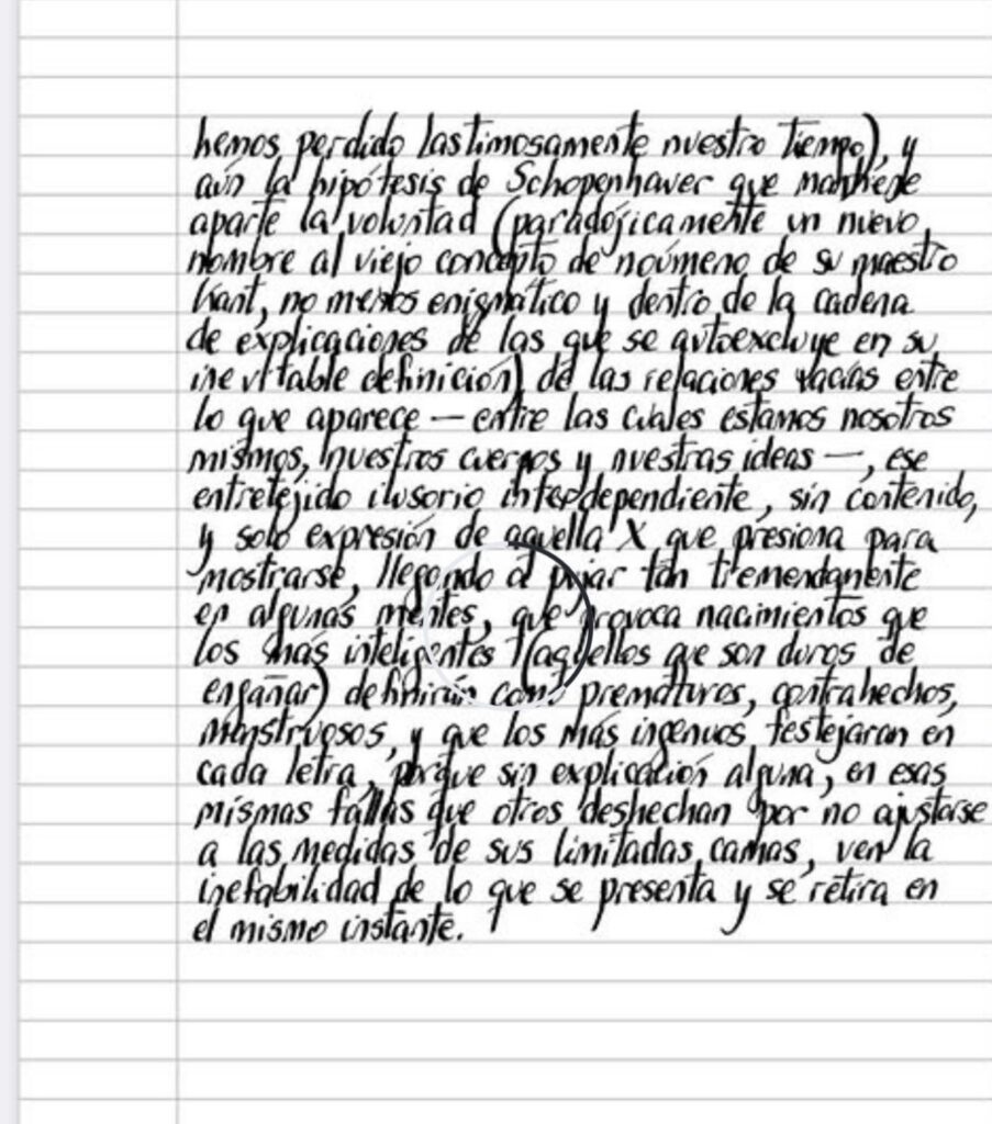​Quizás la filosofía no sea otra cosa que el intento de abordar ese pasaje esquivo de aquello que es, a eso que nos es dado percibir (que en esta instancia se deja dócilmente conocer) y también quizás sean los libros escritos en su nombre el resultado de la pérdida de paciencia a partir de llevar la pregunta cada vez un poco más allá hasta el punto de la desesperación por la inexistencia de respuestas (¿cómo se venderían libros que no dijeran nada, aún peor, de dónde se sacaría la energía para leer letras que se declararan vacías en el mismo prefacio? — no en vano Wittgenstein declara su impotencia al final, cuando ya supuestamente, ​hemos perdido lastimosamente nuestro tiempo), y aún la hipótesis de Schopenhauer que mantiene aparte la voluntad (paradójicamente un nuevo nombre al viejo concepto de noúmeno de su maestro Kant, no menos enigmático y dentro de la cadena de explicaciones de las que se autoexcluye en su inevitable definición) de las relaciones vacías entre lo que aparece — entre las cuales estamos nosotros mismos, nuestros cuerpos y nuestras ideas —, ese entretejido ilusorio interdependiente, sin contenido, y solo expresión de aquella ‘X’ que presiona para mostrarse, llegando a pujar tan tremendamente en algunas mentes, que provoca nacimientos que los más inteligentes (aquellos que son duros de engañar) definirán como prematuros, contrahechos, monstruosos, y que los más ingenuos festejarán en cada letra, porque sin explicación alguna, en esas mismas fallas que otros desechan por no ajustarse a las medidas de sus limitadas camas, ven la inefabilidad de lo que se presenta y se retira en el mismo instante.