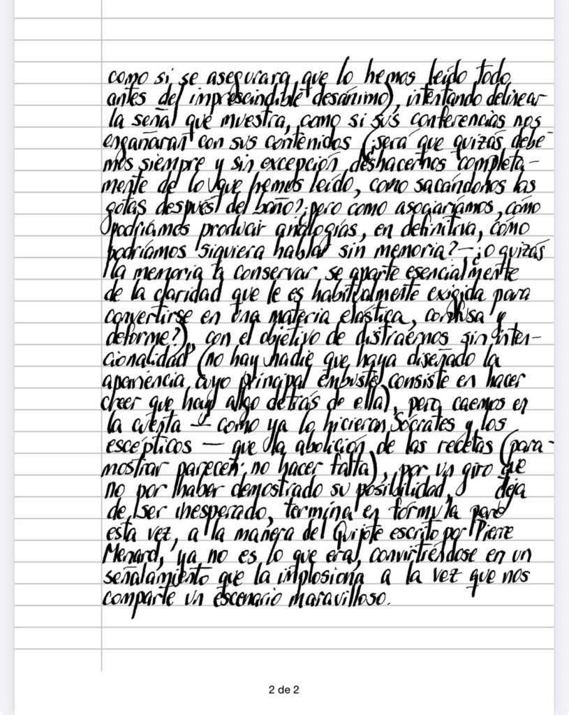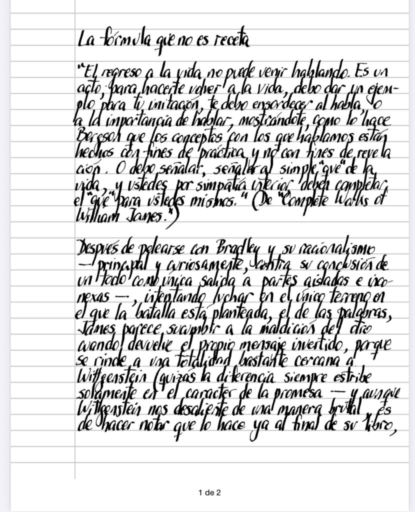 Después de pelearse con Bradley y su racionalismo – principal y curiosamente, contra su conclusión de un todo como única salida a partes aisladas e inconexas -, intentando luchar en el único terreno en el que la batalla está planteada, el de las palabras, James parece sucumbir a la maldición del otro cuando devuelve el propio mensaje invertido, porque se rinde a una totalidad bastante cercana a Wittgenstein (quizás la diferencia siempre estribe solamente en el caracter de la promesa – y aunque Wittgenstein nos desaliente de una manera brutal, es de hacer notar que lo hace ya al final de su libro, como si se asegurara que lo hemos leído todo antes del imprescindible desánimo), intentando delinear la señal que muestra, como si sus conferencias nos engañaran con sus contenidos (¿será que quizá debemos siempre y sin excepción deshacernos completamente de lo que hemos leído, como sacándonos las gotas después del baño?¿pero como asociaríamos, coño podríamos producir analogías, en definitiva, cómo podríamos siquiera hablar sin memoria? – ¿ o quizá la memoria a conservar se aparte esencialmente de la claridad que le es habitualmente exigida para convertirse en una materia elástica, confusa y deforme?), con el objetivo de distraernos sin intencionalidad (no hay nadie que haya diseñado la apariencia cuyo principal embuste consiste en hacer creer que hay algo detrás de ella) pero caemos en la cuenta – como ya lo hicieron Sócrates y los escépticos – que la abolición de las recetas (para mostrar parecen no hacer falta), por un giro que no por haber demostrado su posibilidad, deja de ser inesperado, termina en fórmula pero esta vez, a la manera del Quijote escrito por Pierre Menard, ya no es lo que era, convirtiéndose en un señalamiento que la implosiona a la vez que nos comparte un escenario maravilloso.